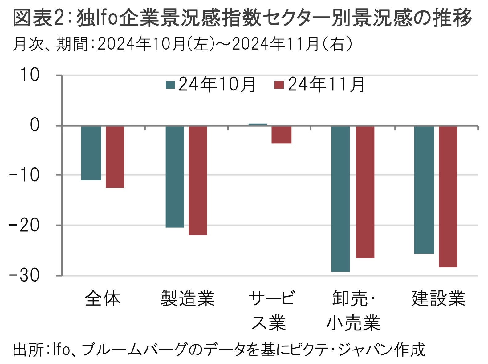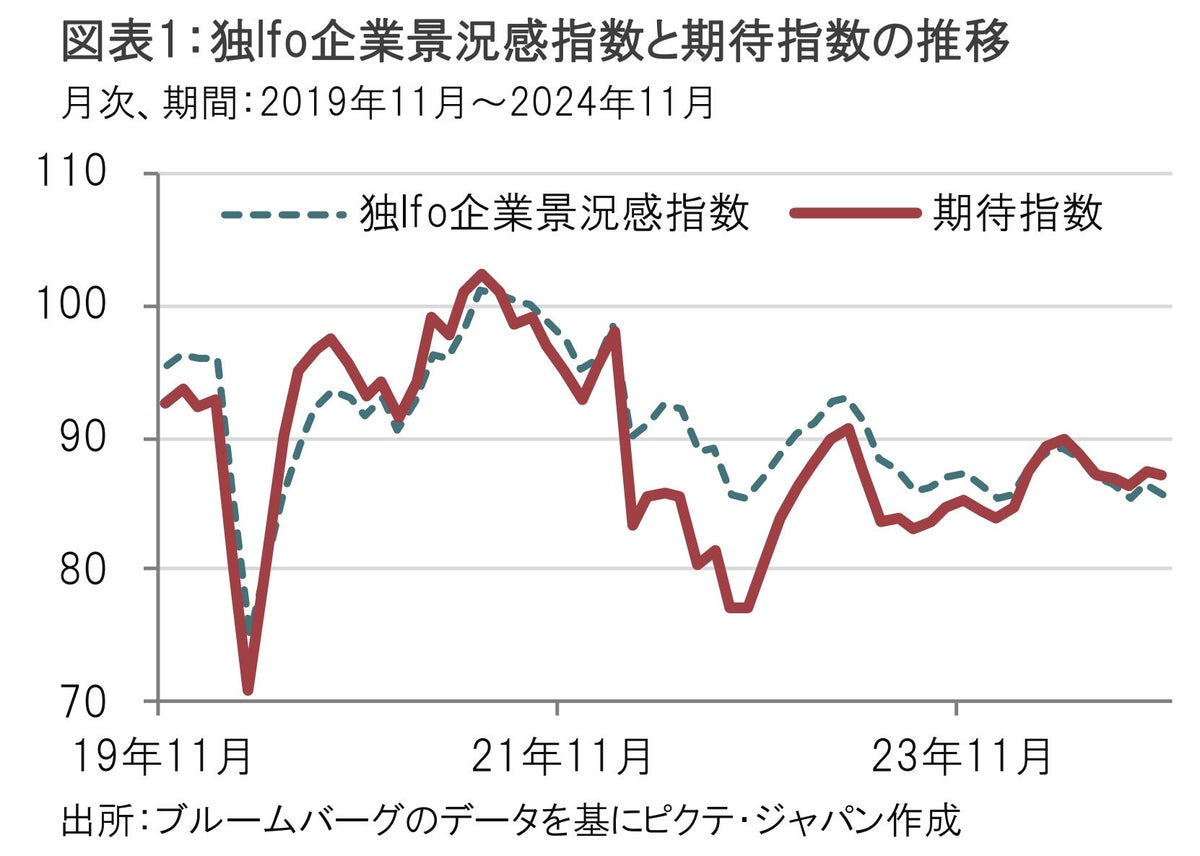 ドイツの景況感に悪化の兆しが見られます。ドイツ経済が軟調な理由として、①主力の自動車産業の不振、②不安定な政治状況、③米トランプ次期大統領の関税政策への不安、④地政学リスクなどがあげられます。欧州中央銀行(ECB)の利下げやインフレ鈍化など景気を下支え要因はあるものの、足元では①~④の影響が大きく、景況感の改善にはさらなるテコ入れが必要です。