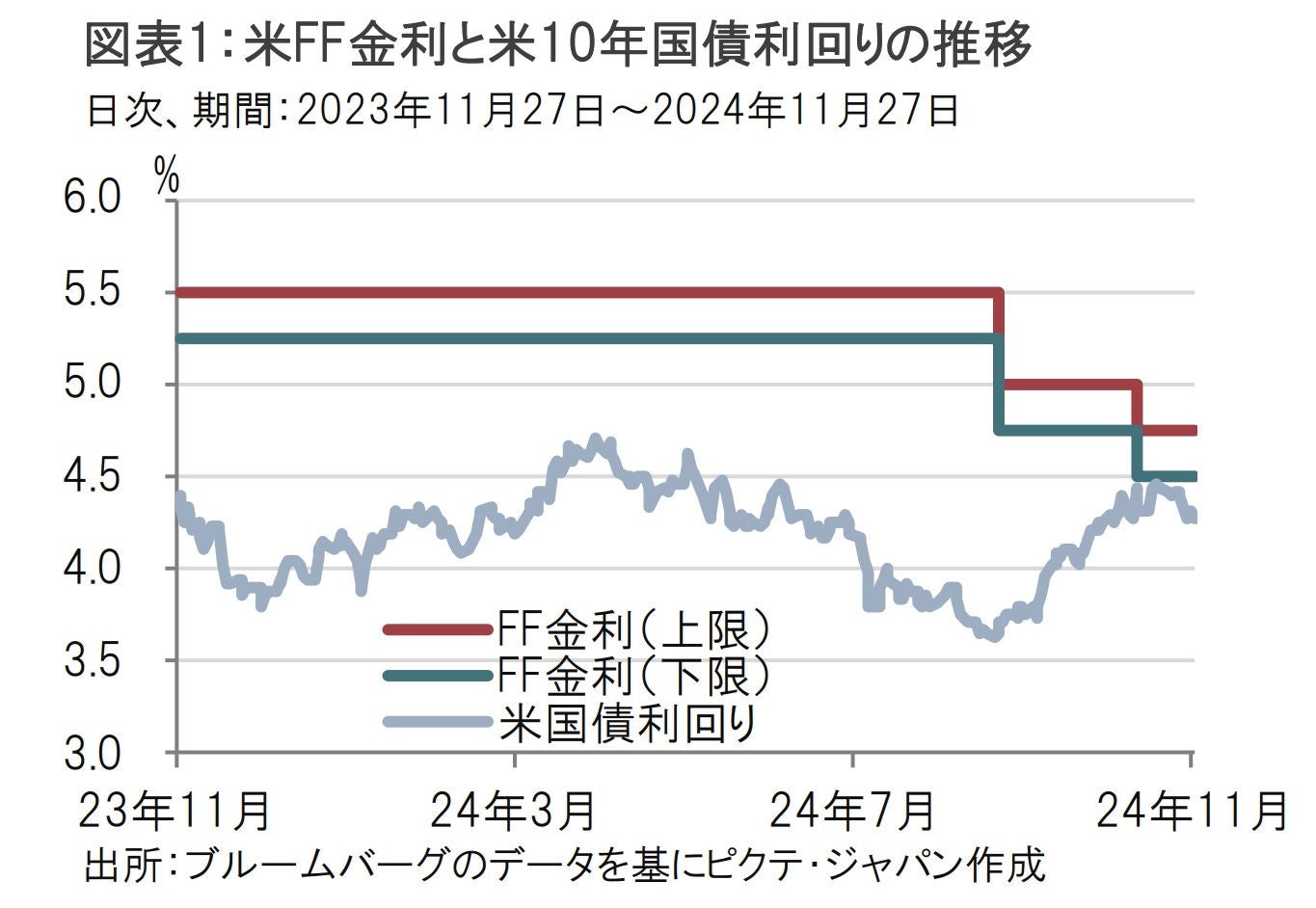米連邦準備制度理事会(FRB)は11月26日、米連邦公開市場委員会(FOMC、11月6〜7日開催)の議事要旨を公開しました。11月のFOMCでは政策金利(フェデラルファンド(FF)金利)の誘導目標を市場予想通り0.25%引き下げ4.50%~4.75%としました(図表1参照)。