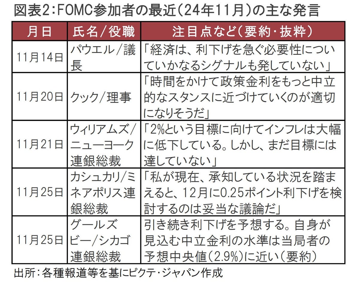 11月のFOMC議事要旨で示唆された緩やかな利下げペースはFOMC後の参加者の発言からもうかがえます(図表2参照)。