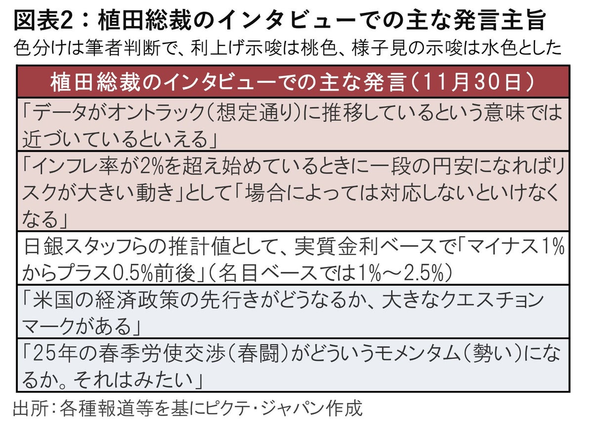 植田総裁の11月30日付インタビューの主な発言内容を振り返ると(図表2参照)、「データが想定通りに推移という意味では(利上げの時期は)近づいている」、という点と円安に対応しなければいけない場合もあると述べた点で、これまでよりも追加利上げに踏み込んだ印象です。