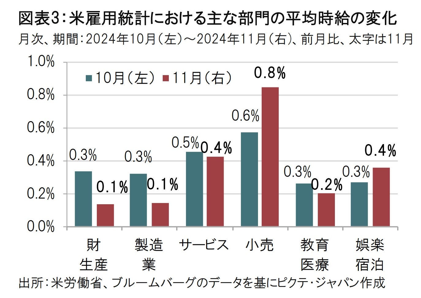 ただし、部門別にみると、賃金の伸びとインフレとの相関が高いとみられるサービス部門の伸びは前月比0.4%上昇と前月を下回りました(図表3参照)。またサービスに含まれる小売部門の伸びは0.8%上昇と例外的に高く底上げされている可能性もありそうです。