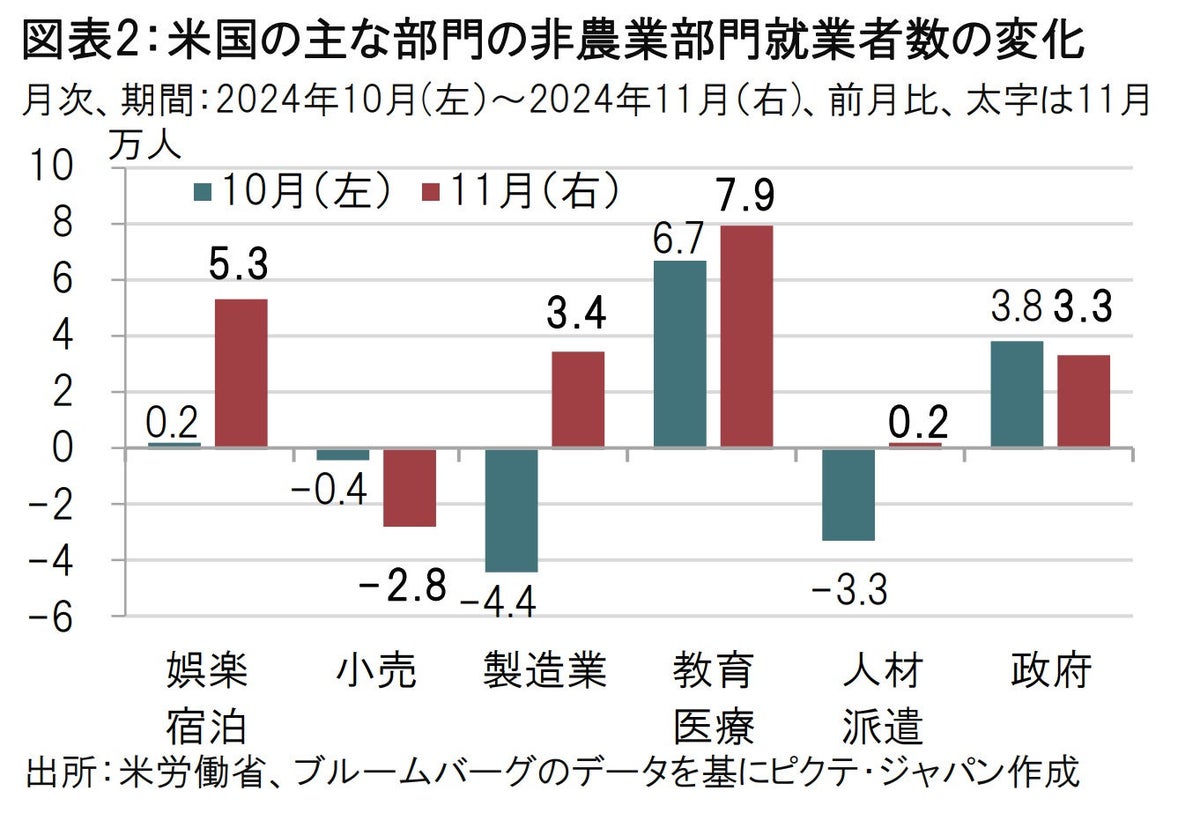 非農業部門の就業者数の伸びを部門別にみると、10月の就業者数急落の背景であった悪天候とストライキで影響を受けたと思われる部門に回復が見られました(図表2参照)。天候要因としては娯楽・宿泊や、図表にはありませんが建設業も11月の就業者数の伸びが前月を上回りました。
