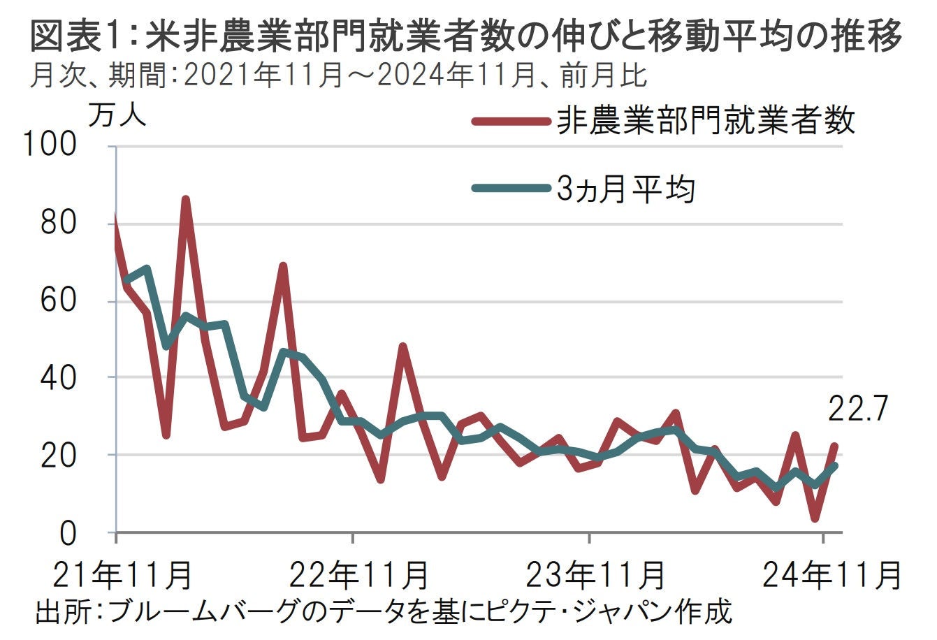 悪天候やストライキの影響を均すため3か月移動平均でみると、11月の非農業部門の就業者数の伸びは17万人超と、米労働市場は堅調であることを示唆する数字と見られます。