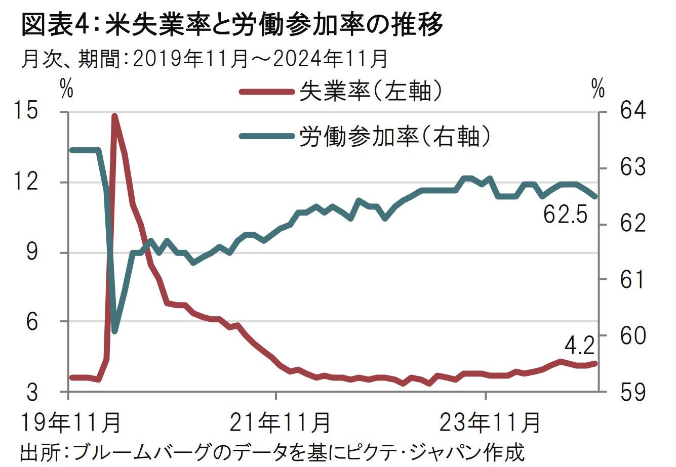 ただし、11月の失業率では労働市場参入の活況度合いを示す労働参加率が低下(悪化)した中で失業率が上昇した点は気がかりです。仮にこのような傾向が続くとしたら、米労働市場にとっては注意信号となる可能性もあります。