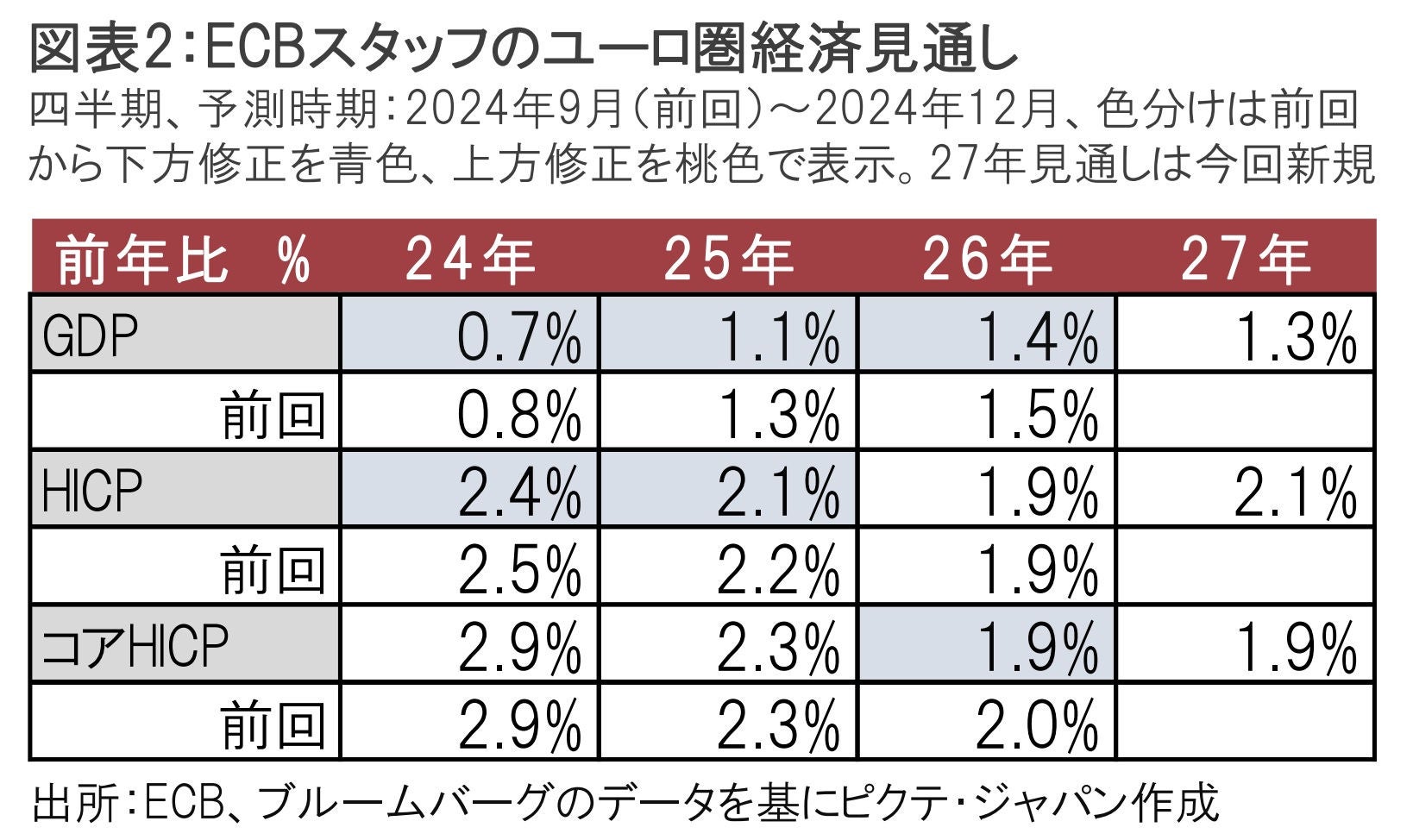 12月の理事会ではECBスタッフによる、四半期毎の経済見通しが発表されました(図表2参照)。特にGDP(国内総生産)成長率は24年から26年まですべて前回(9月見通し)から下方修正されており、ユーロ圏景気への配慮が利下げの背景であったことがうかがえます。