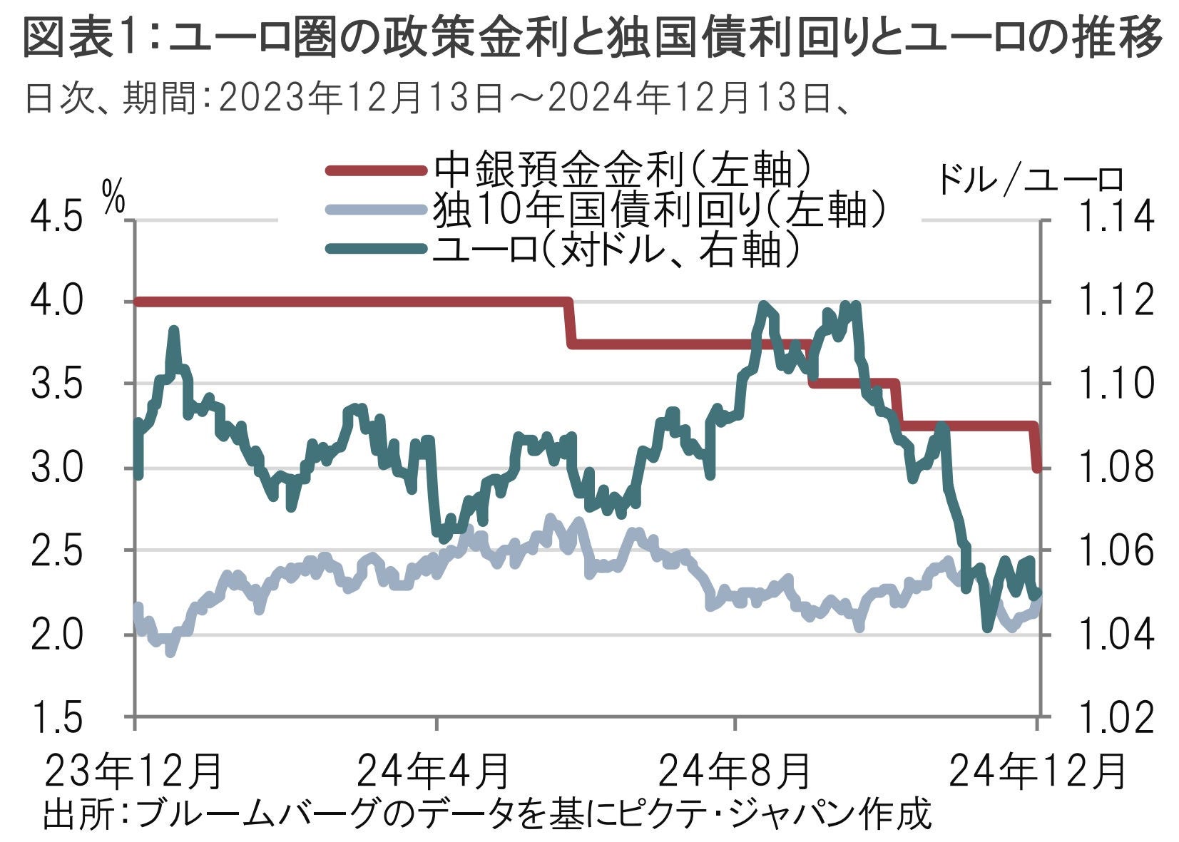 欧州中央銀行(ECB)は12月12日の政策理事会で、市場予想通り0.25%の利下げを決定し(図表1参照)、事実上政策金利としている中銀預金金利を3.25%から3.00%へ引き下げました。利下げは3会合連続となります。ユーロ圏の景気回復が鈍く、物価だけでなく景気の安定にも配慮したことが利下げの要因で、全会一致での決定ながら大幅利下げの検討を求める意見もあったようです。