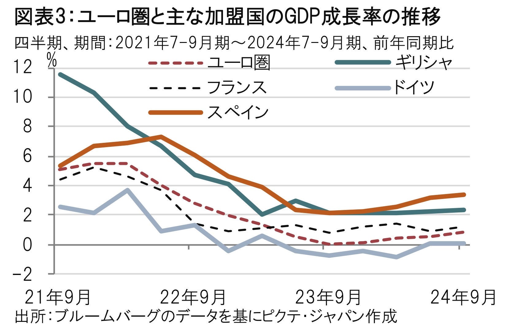 ユーロ圏の景況感が強弱まちまちなことも大幅利下げを難しくさせた可能性があります。ユーロ圏と主な国のGDP成長率を見ると、ユーロ圏は7-9月期が前年同期比0.9%増と軟調で、大幅利下げが検討される理由となりそうです(図表3参照)。しかし、ユーロ圏の成長率が低いのは政治が混乱しているドイツとフランスの成長率が低いことが主因です。反対にスペインは3.4%増、ギリシャが2.4%増など堅調な成長を維持している国もあります。加重平均でGDP成長率を算出することと、その数字で政策運営してよいかは別問題と思われます。