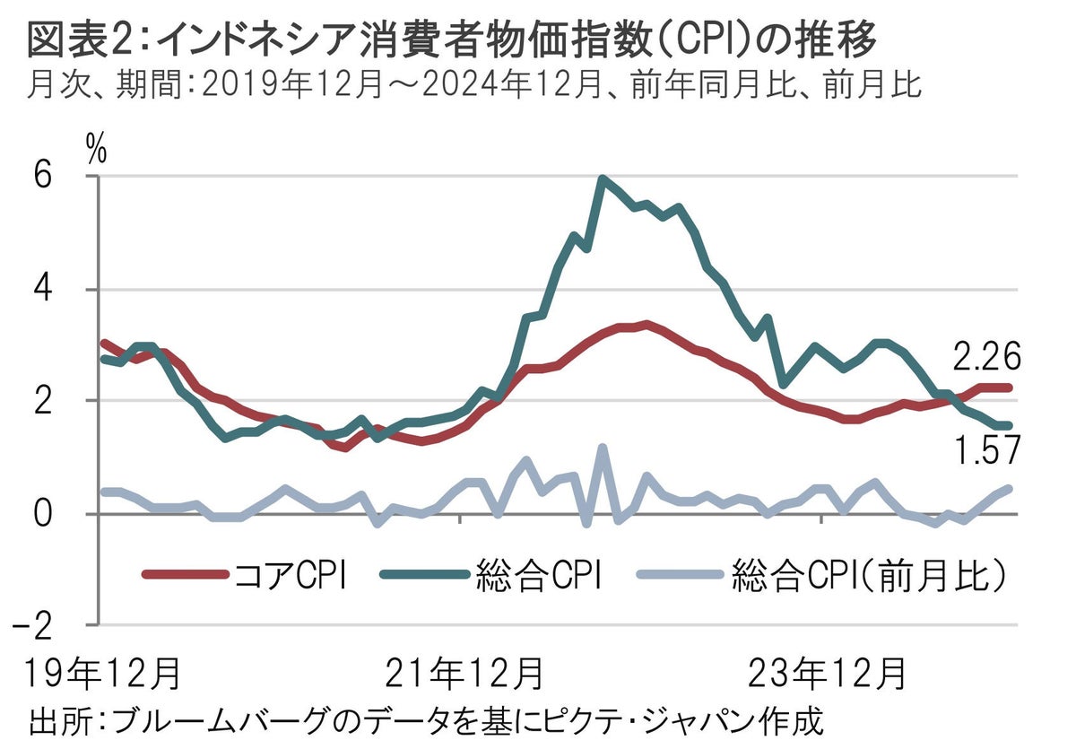 市場予想では何割程度が見込んでいるかも重要だ。今回の据え置きは、予想の分布をみるとほぼ全員が据え置きを見込んでいたと思われる。それはもっともで、発表された経済指標などから利下げの理由を見つけにくい。インドネシア中銀の前回の会合は昨年12月18日で、それから1月会合までの間に公表された主な経済指標として消費者物価指数(CPI)を見ると12月は前年同月比で1.57%上昇と、11月の1.55%上昇と変わらず、コアCPIは12月が2.26%上昇と、前月から横ばいだ。