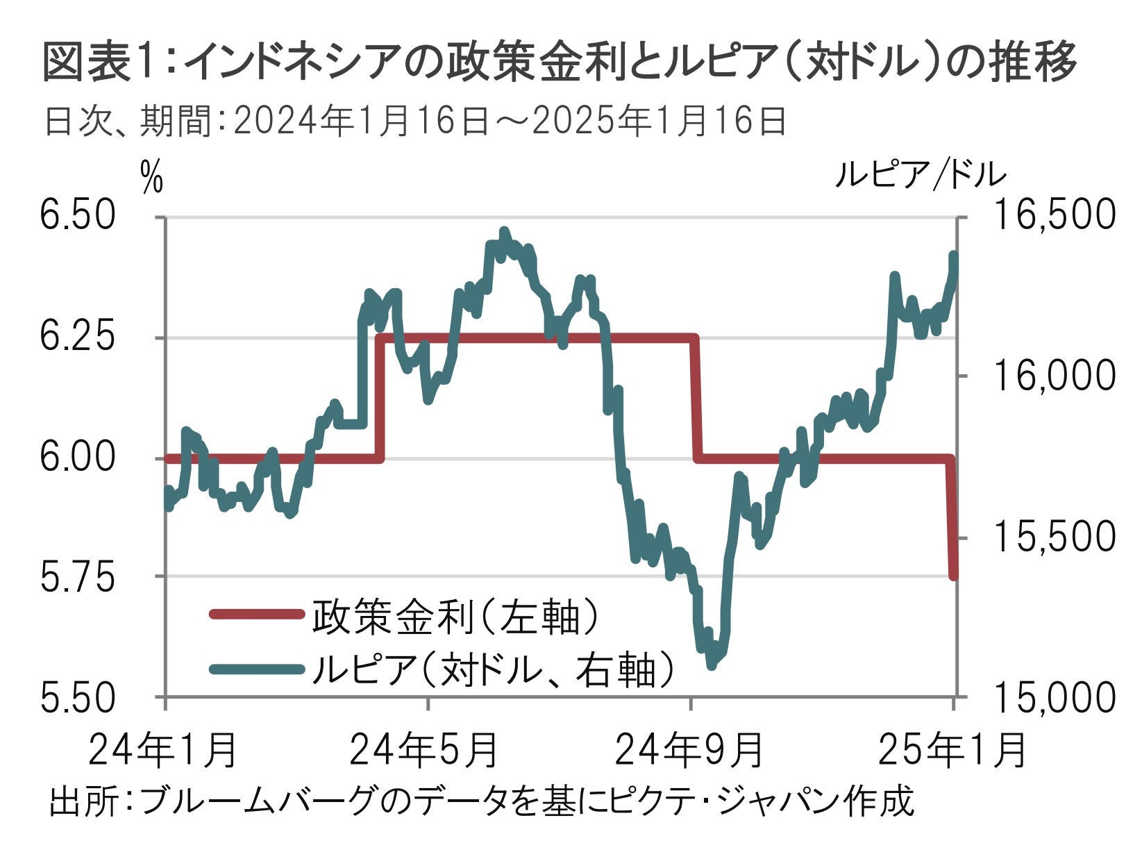 インドネシア中央銀行は1月15日、市場予想の据え置きに反し、政策金利(7日物リバースレポ金利)を0.25%引き下げ、5.75%にすると発表した(図表1参照)。