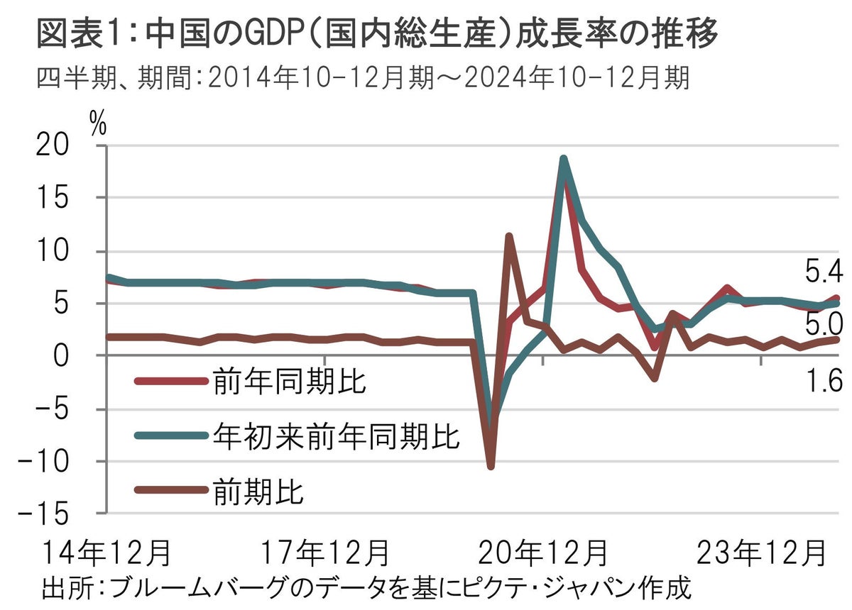 中国国家統計局が1月17日発表した24年10-12月期のGDP(国内総生産)は、物価の変動を調整した実質で前年同期比が5.4%増と、前期の4.6%増を上回った(図表1参照)。年初来で見ると、5.0%増で、政府目標の「5%前後」は達成したが、伸びは23年の5.2%に及ばなかった。前期比の伸びは10-12月期が1.6%増と、23年1-3月以来の大きさで回復が見られた。