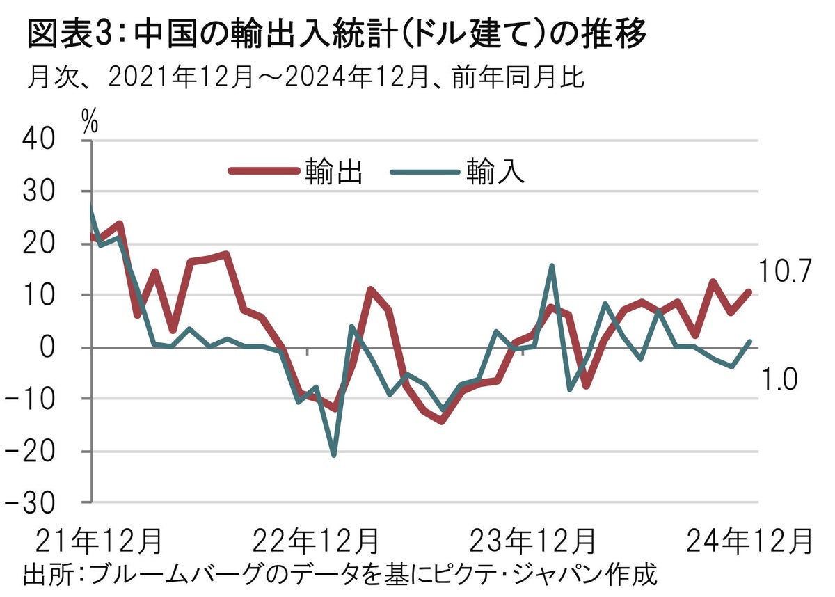 消費以外で中国の24年のGDPを支えたのは輸出だったが、主要なけん引役はEVなどだ。12月の輸出は前年同月比10.7%増と、前月の6.6%増を上回り堅調で、輸入の伸びを上回ったことから純輸出はプラスであった。輸出の項目を見ると、新エネルギー車は約39%増、集積回路等も約22%増と、けん引役であったことがうかがえる。