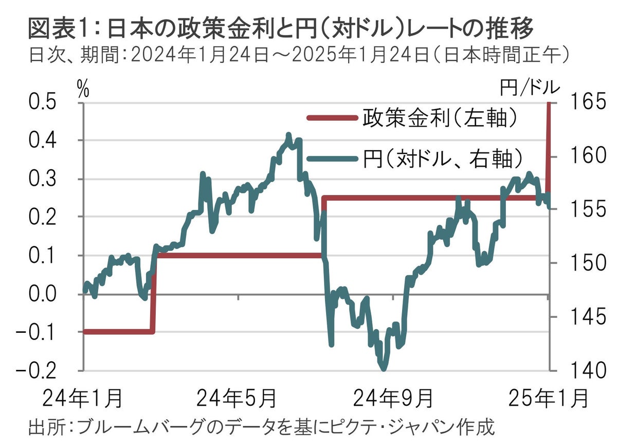 日本銀行は1月23~24日に開催した金融政策決定会合(会合)で、市場予想通りに政策金利を0.25%引き上げ0.50%とした(図表1参照)。日銀は24年7月に利上げを決定した後、3会合連続で政策金利を据え置いていたが、「展望レポート」に示してきた見通しに概ね沿って推移し(オントラック)、先行き見通しが実現していく確度は高まっていると判断したことを利上げの理由とした。