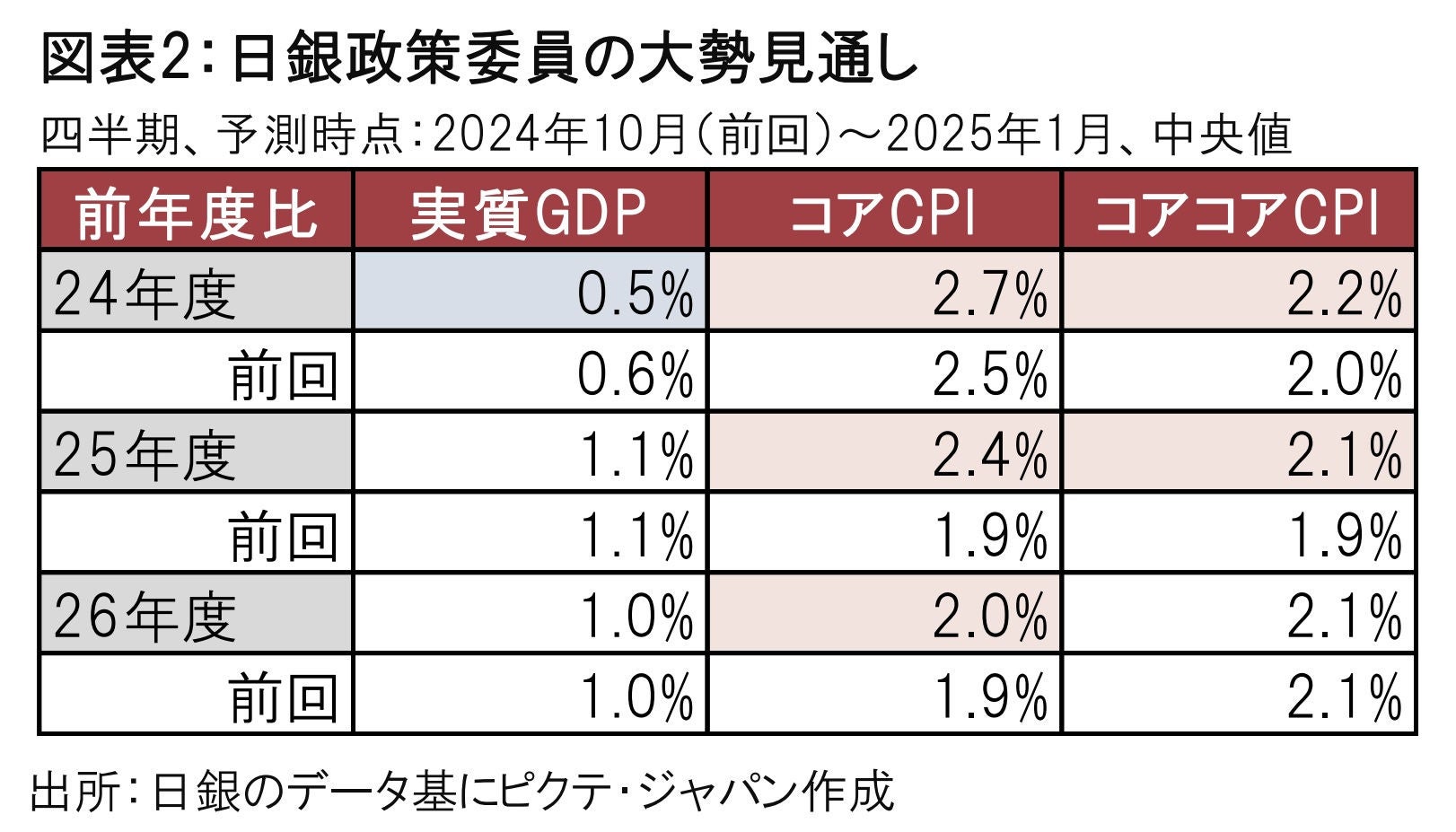 今回の日銀の発表でタカ派寄りだった主な内容を振り返る。目立つのは、展望レポートのインフレ見通しが大幅に上方修正された点だ。図表2にあるように、25年度のコア消費者物価指数(CPI、除く生鮮食品)の伸び率見通しは今回2.4%上昇と、前回(24年10月)の1.9%から大幅に上方修正され、数字上はインフレ懸念が示唆された。