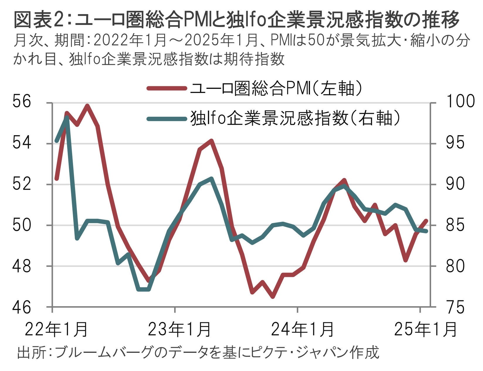 ユーロ圏の景況感指数の一部に小幅ながら改善が見られたことは、足元のユーロの下支え要因と見ている。1月24日にS&Pグローバルが発表した1月のユーロの圏総合購買担当者景気指数(PMI、速報値)は50.2と、前月の49.6、景気拡大・縮小の分かれ目となる50を上回った(図表2参照)。