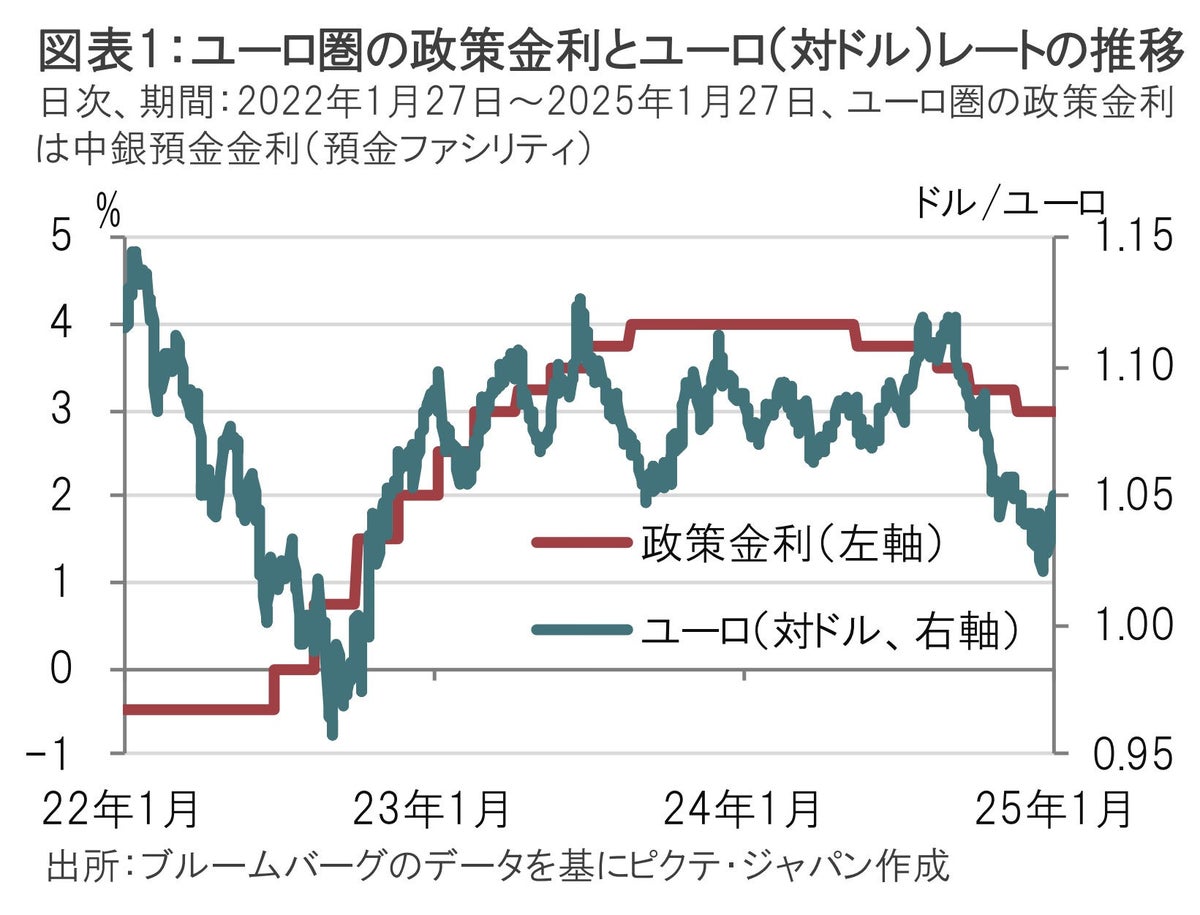 通貨ユーロは24年後半に先安観が強まり、市場では1ユーロの価値が1ドルを下回る「パリティ(等価)割れ」を見込む声が強まった。24年9月末にユーロは1ユーロ=1.12ドル近辺であったが、25年1月半ばに1ユーロ=1.02ドル台までユーロ安が進行した(図表1参照)。昨年後半のユーロ安の要因として、ユーロ圏の景況感悪化に伴う欧州中央銀行(ECB)の緩和姿勢、ドイツ(独)やフランス(仏)の政局不安などが挙げられる。