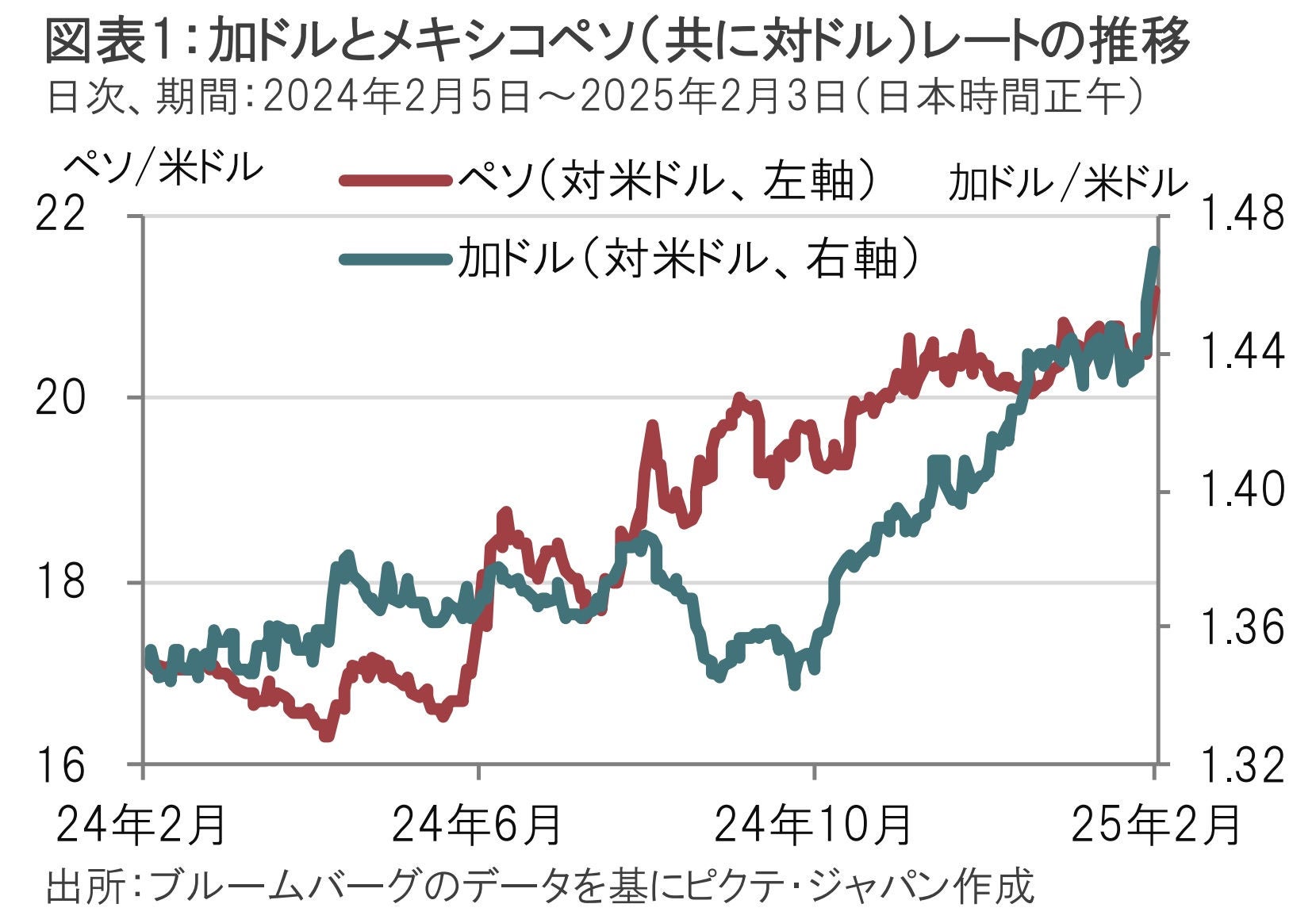 カナダなどへの関税は不法移民や合成麻薬「フェンタニル」の流入等を理由とし、国際緊急経済権限法(IEEPA)に基づき発動された。カナダ、メキシコは報復関税などの対抗措置の意向を表明した。関税発動を受け、カナダやメキシコ通貨は大幅安となったが(図表1参照)、影響は株式、債券、商品、為替など様々な市場に広がっている。