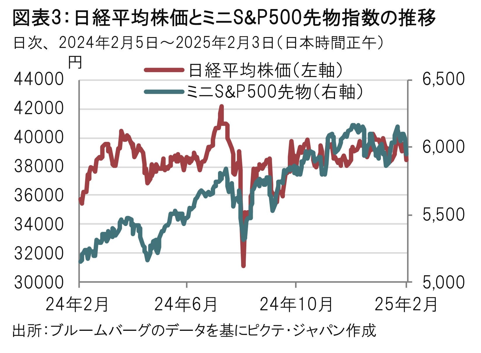 米国債は米国取引時間前という点は割り引く必要はあるが、小幅な動きとなっている(図表2参照)。関税が景気を押し下げるとの観測からリスクオフは国債の買い(利回り低下)要因で長期債利回りは小幅低下した。一方、インフレ懸念は国債の売り(利回り上昇)要因だ。市場で観察される期待インフレ率は関税発動を受け上昇した。米国のサプライチェーンの要であるカナダやメキシコ、日用品の輸入先である中国への関税発動はインフレを悪化させる可能性もあり、売り買い要因が相殺した。