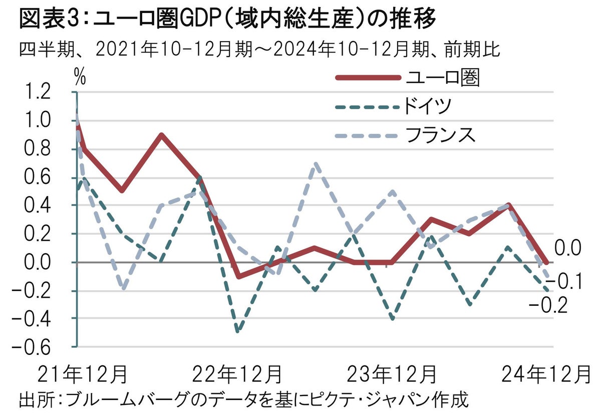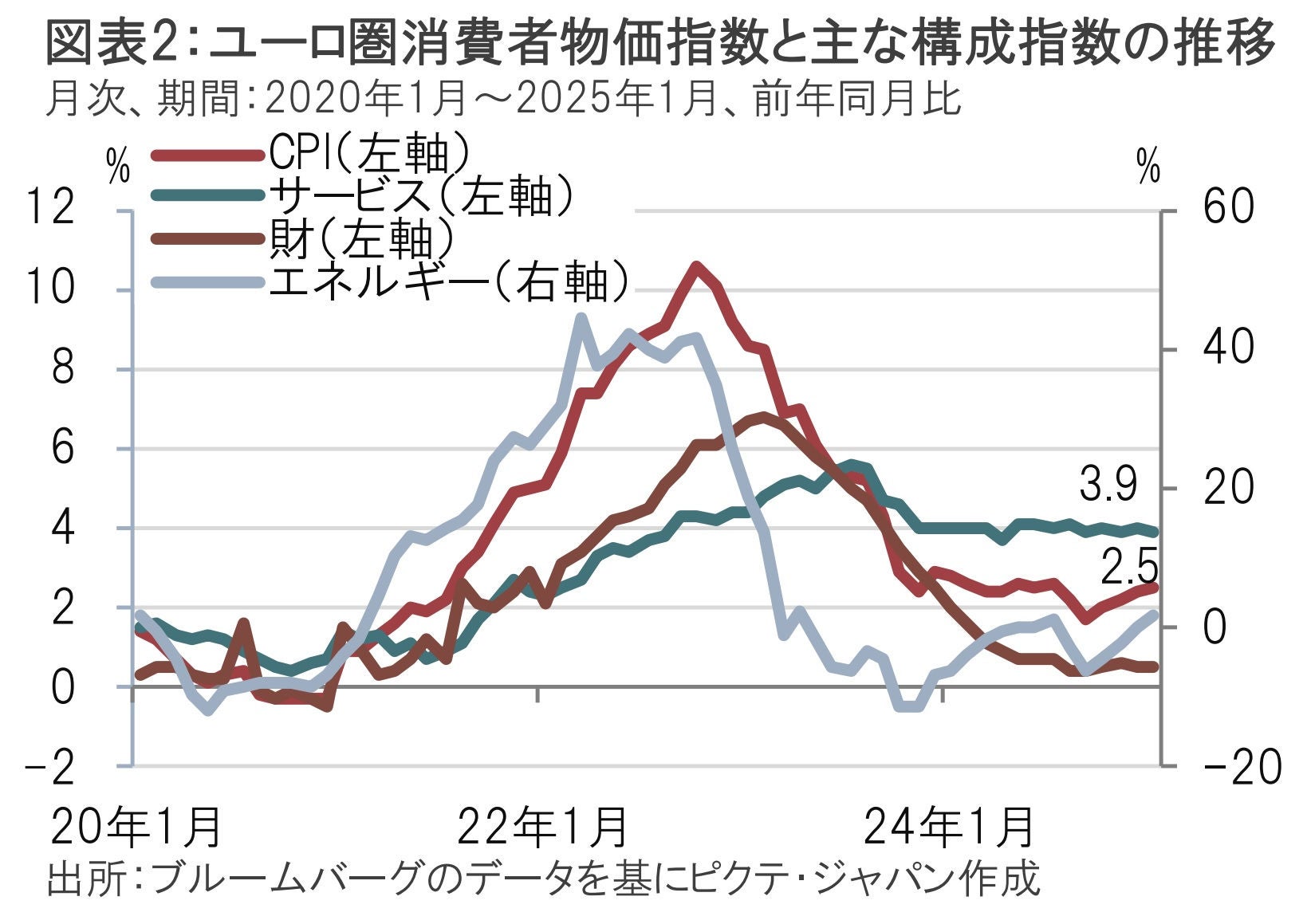 インフレ率を3日に発表された1月のユーロ圏消費者物価指数(CPI、欧州連合(EU)基準、HICP)で振り返る(図表2参照)。総合CPIは前年同月比で2.5%上昇と、市場予想、前月(ともに2.4%上昇)を上回った。24年9月の1.8%上昇から4ヵ月連続で前月を上回った。しかし、足元の総合CPIの押し上げ要因は昨年低水準だったエネルギー価格の(前年比での)反動が大きい。1月のユーロ圏CPIが発表されたのはECB理事会の後だが、ECBはエネルギー価格要因による押し上げはこれまで再三指摘しており、仮にECB前にCPIの発表があっても、あまり問題視しなかっただろう。