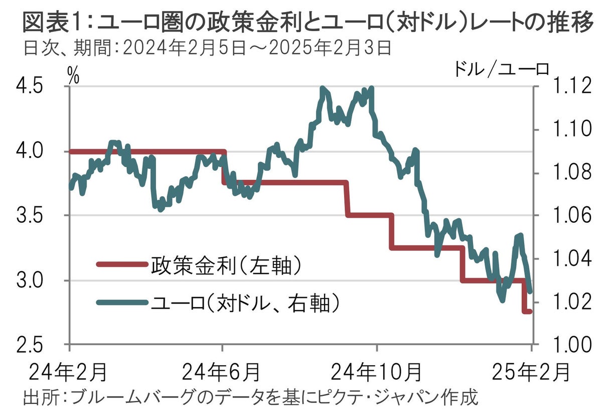 欧州中央銀行(ECB)は1月30日の理事会で、政策金利(中銀預金金利)を3.00%から0.25%引き下げ2.75%とすることを決定した(図表1参照)。政策金利の引き下げは4会合連続で、市場でもほぼ全員が0.25%の利下げを見込んでいた。