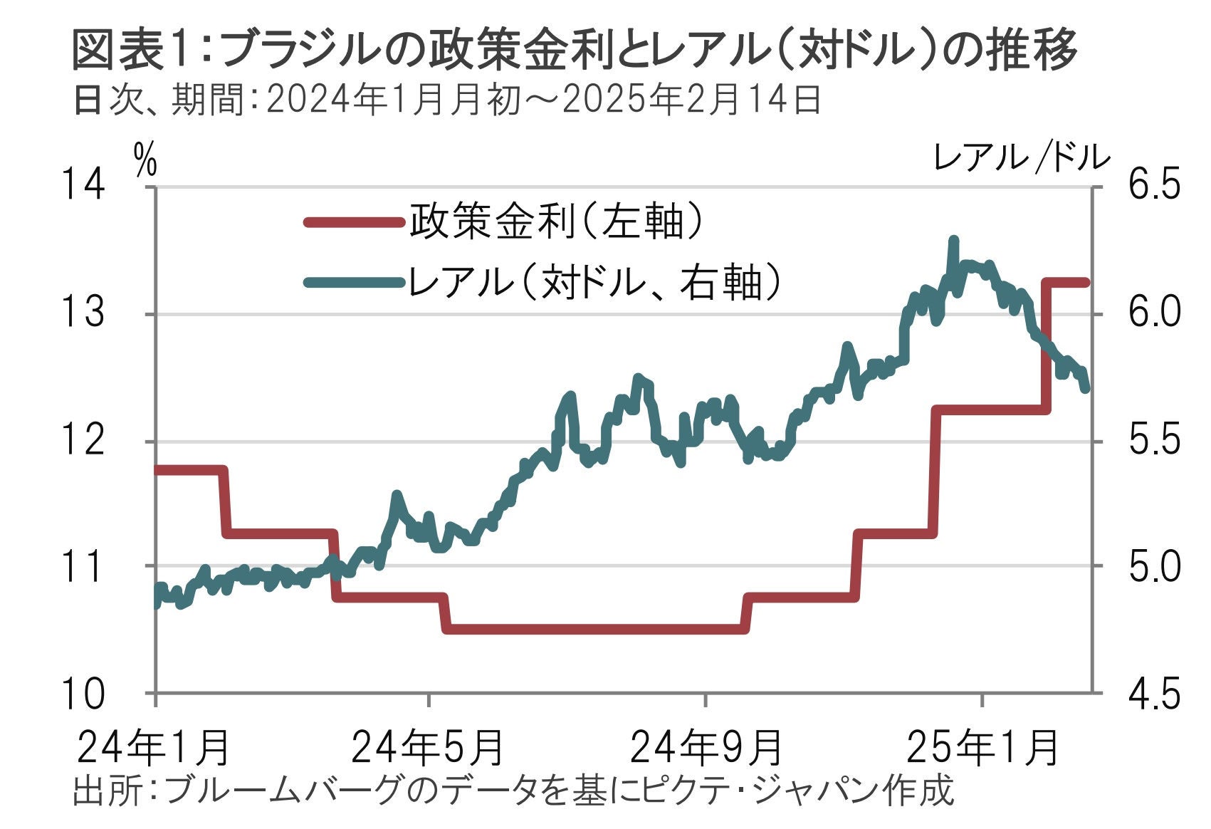 ブラジル中銀は25年1月の会合でも利上げ幅を1%と2会合連続で大幅利上げを決定し、レアル安抑制姿勢を維持した。そのうえ、フォワードガイダンス(今後の政策方針)で次回(3月)会合でも利上げ幅を1%とする可能性を示唆した。
