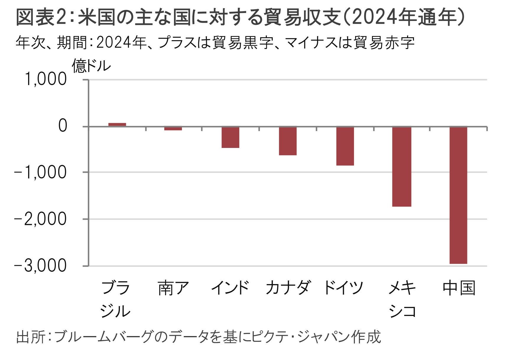 トランプ政権の関税政策への懸念が若干緩和したこともレアル下支え要因と思われる。短期的には2月13日にトランプ大統領が署名した相互関税導入は4月頃と、即時導入が見送られたことは短期的にレアル、並びに新興国通貨全般にプラス要因だった。24年11月の米大統領選挙でトランプ氏有利の観測で引き起こされた、米国金利上昇、関税への懸念はレアル安要因だった。しかし、米国の金利上昇は落ちついている。また、関税についてもブラジルは対米の貿易収支が米国の黒字(ブラジルの赤字)となっている数少ない国だ(図表2参照)。トランプ政権は関税を麻薬流入阻止などを理由としているが、本音は米国の貿易赤字縮小だろう。関税のやり玉に挙がったのが中国、メキシコ、カナダと、貿易赤字の規模に応じて関税を決めているようにも見える。そうした中、相互関税は導入の時期が4月頃となりそうなことに加え、個別交渉の余地があることを踏まえると、関税の条件は貿易赤字だけではないとしても、米国から見て黒字のブラジルは優位な立場かもしれない。