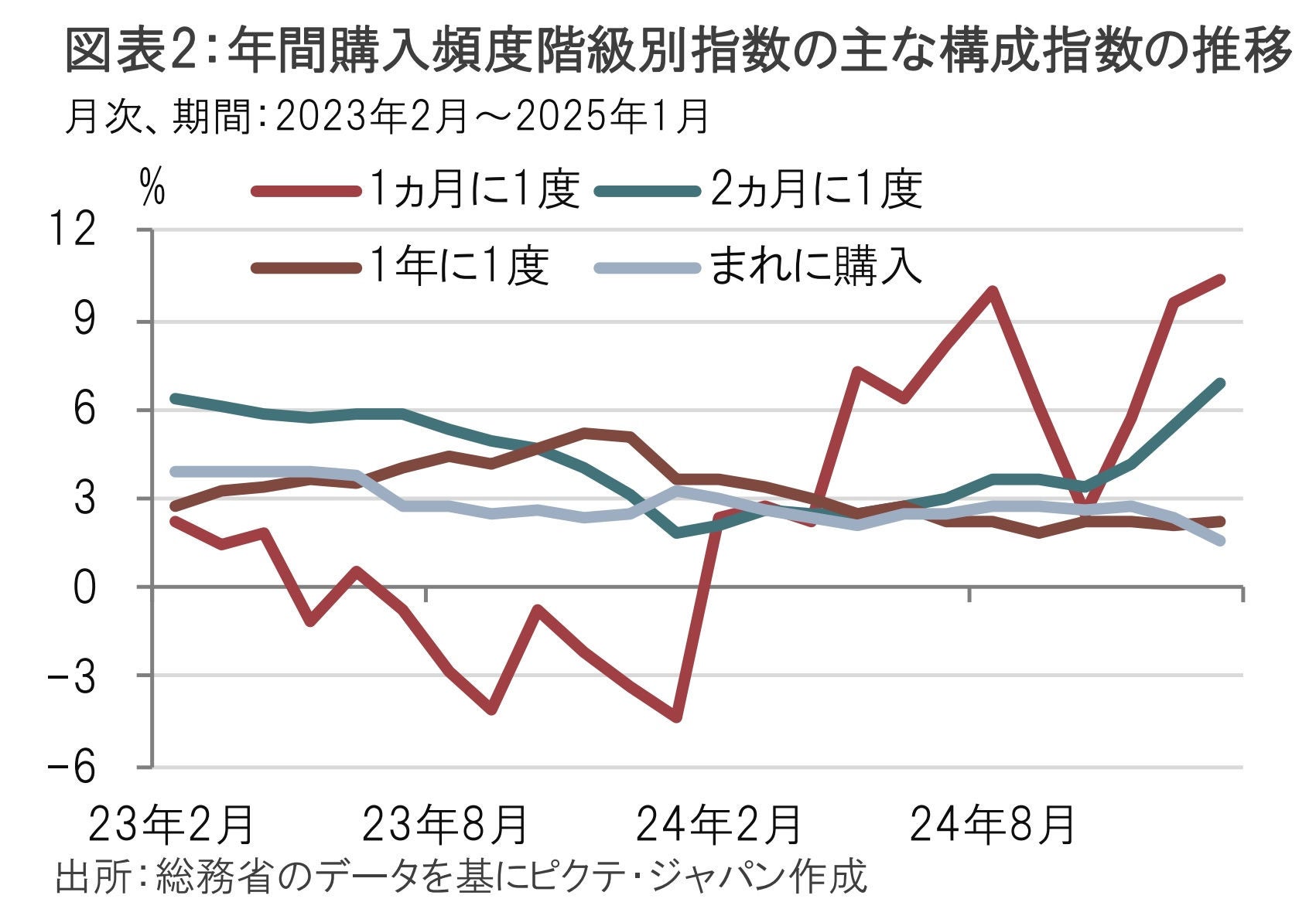 なお、電気代やガス料金も前年に比べ上昇しているが、これは24年8月から10月の使用分に対して実施された電気・ガス料金支援が昨年末に打ち切られた時点で上昇したもので、1月の電気代やガス料金を前月比で見るとほぼ横ばいだった。