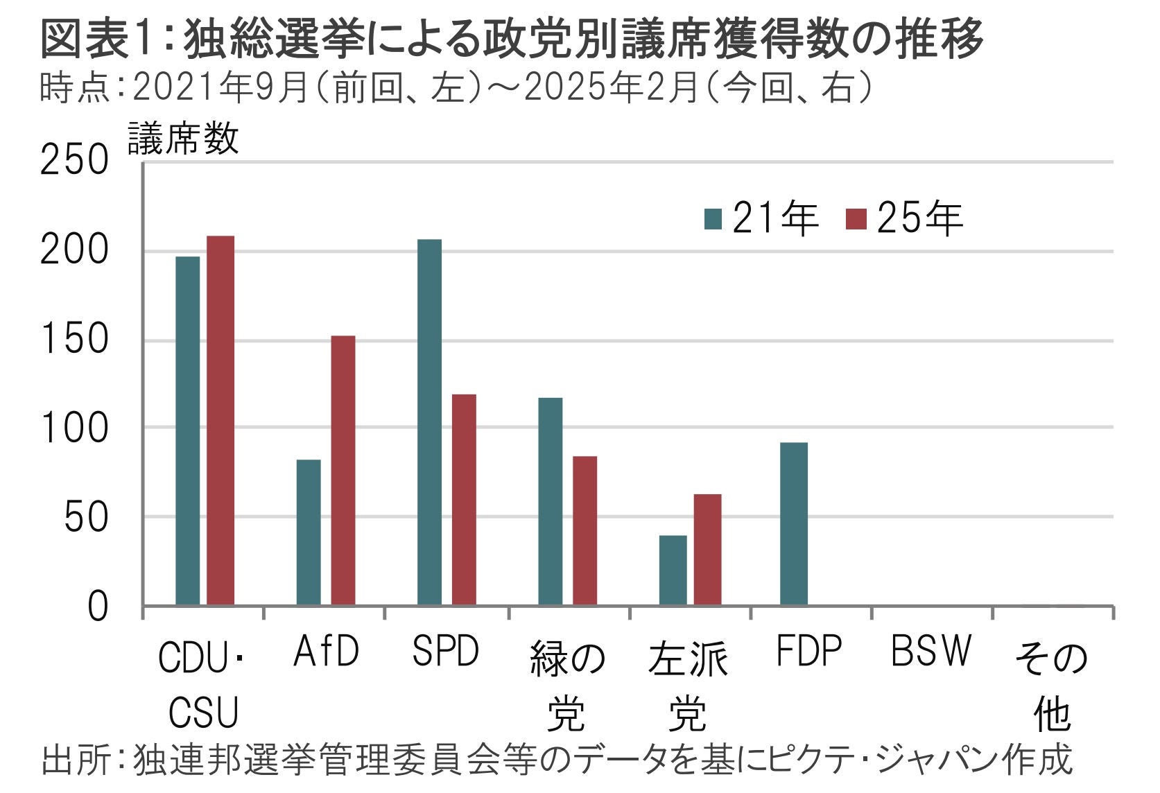 ドイツ(独)総選挙が2月23日に投開票された。保守系野党のキリスト教民主・社会同盟 (CDU・CSU)が得票率(28.6%)を獲得、議席数を208議席とし第1党となった(図表1参照)。第2党となった極右政党「ドイツのための選択肢(AfD)」は152議席と躍進した。ショルツ首相の社会民主党(SPD)は120議席と大幅に議席数を減らし、3番手に後退した。昨年まで連立政権を組んでいた自由民主党(FDP)、1月に発足した左派新党の「ザーラ・ワーゲンクネヒト同盟(BSW)」は共に得票率が5%を下回り、議席を獲得できなかった。