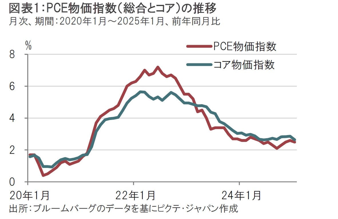 米商務省が2月28日に発表した1月の米個人消費支出(PCE)物価指数は前年同月比で2.5%上昇と、市場予想の2.5%上昇に一致し、24年12月の2.6%上昇を下回った(図表1参照)。変動が大きいエネルギーと食品を除いたコア物価指数は前年同月比で2.6%上昇と、市場予想に一致し、前月の2.9%上昇を下回った。短期的な変動を示唆する前月比の伸びも総合指数とコア指数はそれぞれ0.3%上昇し、市場予想と一致した。