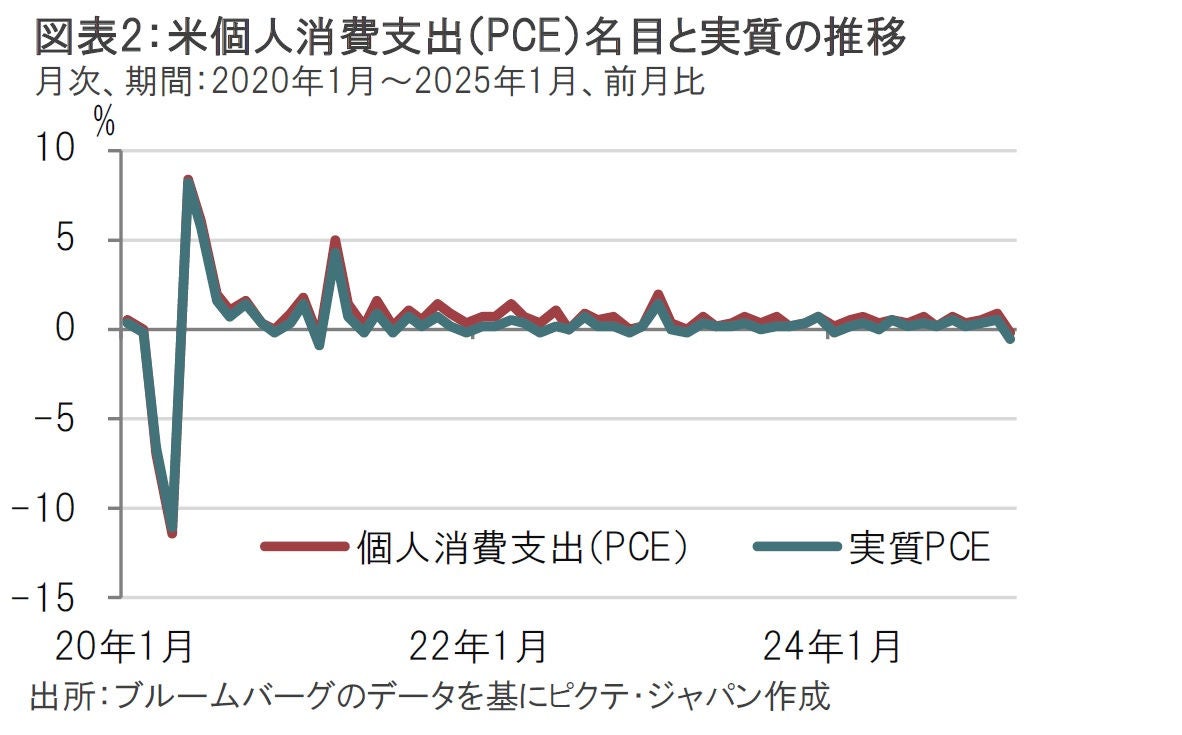 1月のPCE統計では物価指数に加え、個人消費支出の動きも注目された。1月のPCEは前月比で0.2%減と、市場予想の0.2%増、12月の0.8%増を大幅に下回った(図表2参照)。実質ベースの個人支出で見ても、0.5%減と前月の0.5%増を大幅に下回った。支出を品目別にみると自動車・部品が落ち込んだ。娯楽用品も伸び悩んだ。衣服や食料なども前月のプラスから、1月は伸びがマイナスとなった。1月は山火事や寒波の影響が自動車購入などに影響した可能性もあり、指標から消費が伸び悩んだと判断するには時間も必要だ。ただ、サービス消費が外食などを除いてやや伸び悩んだのは気になるところだ。