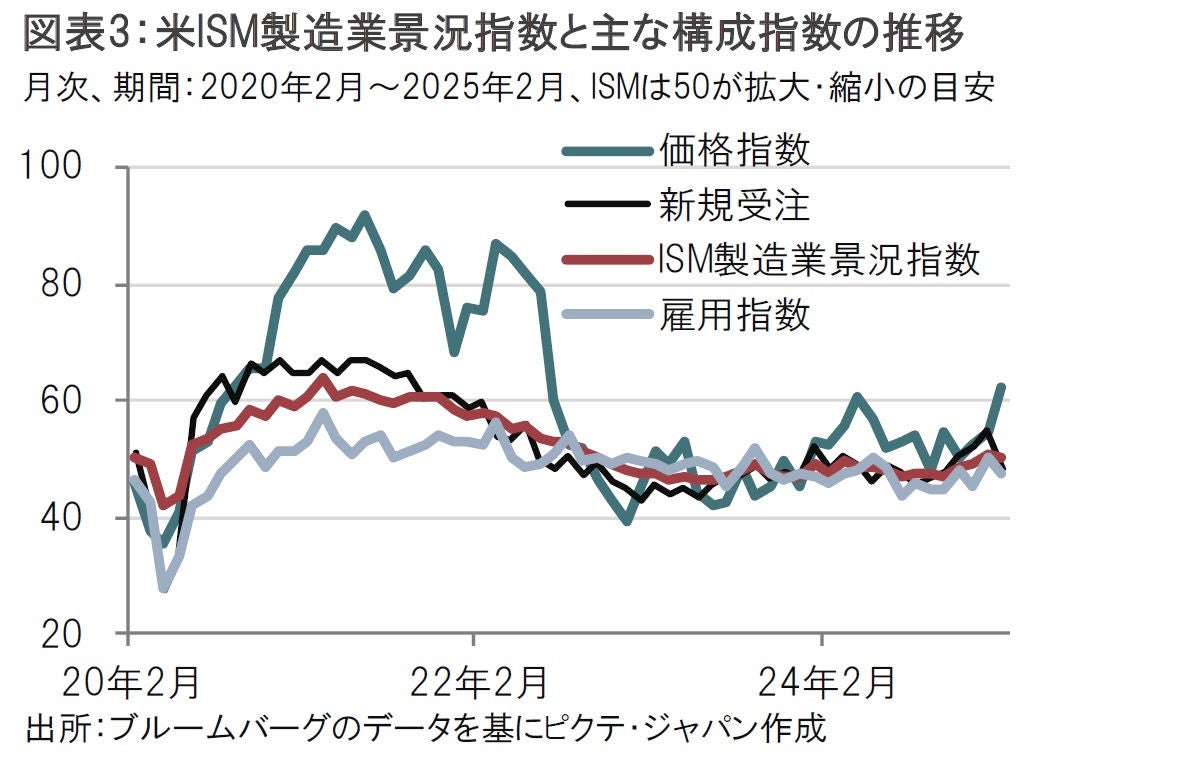 1月のPCE統計発表を受け、物価の落ち着きを安心材料に当日の米株式市場が上昇したのもつかの間、翌週の3月3日に発表された2月の米ISM製造業景況指数はPCE統計の不安材料を浮き彫りにした面もあり市場は軟調だった(図表3参照)。