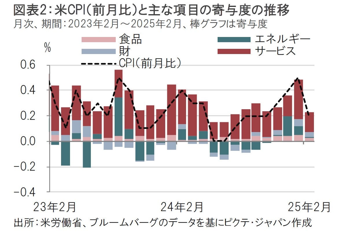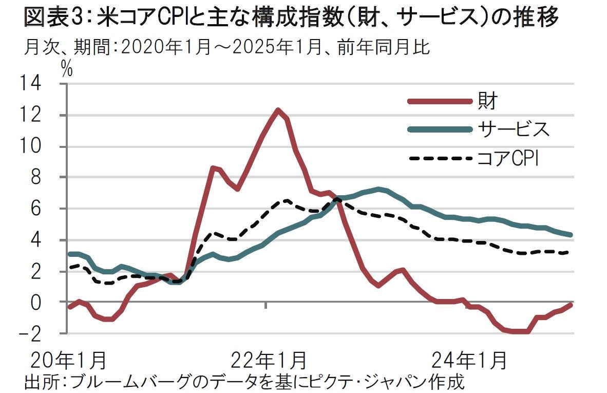 ③の関税の影響は2月のCPIでは確認できなかった。トランプ政権は2月4日に中国からのすべての輸入品に対して10%の追加関税を発動した。物価などへの影響が気になるところだが、逆に言うと2月の発動は限定的で、CPIへの影響も限られたようだ。関税引き上げの影響は特に財項目に影響するとみられるが、2月の財は前月を下回っている。関税が本格化するのはこれからで、3月4日にはカナダとメキシコからの輸入品に25%の一律関税を発動した(カナダからのエネルギー輸入は10%)。4月には相互関税も予定されている。