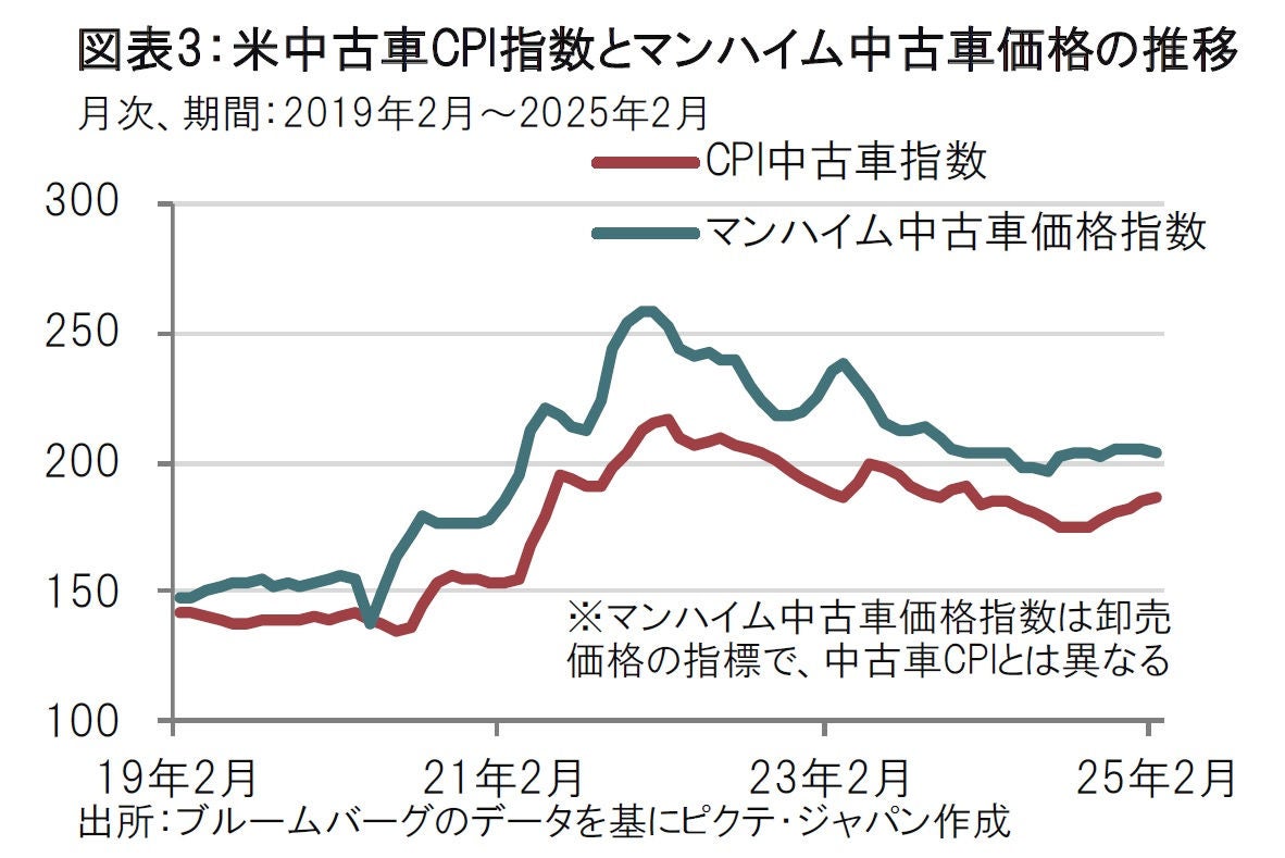 注目したい項目である財は前月比0.2%上昇と、1月の0.3%上昇を下回った。衣服や家具など1月を上回った品目もあったが、娯楽用品などが下落幅を拡大させた。新車は0.1%上昇と伸び悩み、中古車は前月の大幅な伸びから鈍化した。なお、中古車の市場価格は比較的落ち着いており、今後の展開を注目している(図表3参照)。
