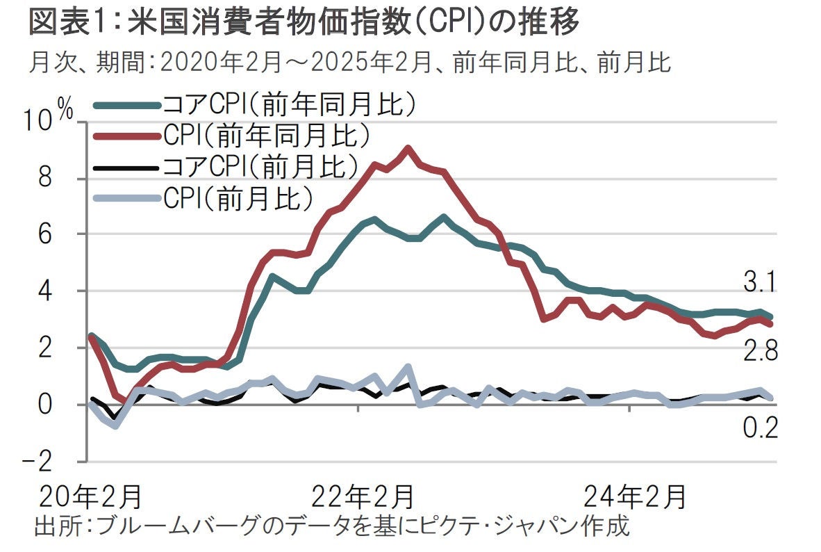 2月の米CPIは市場予想を下回り物価再加速懸念は後退した。しかし、米国債市場の反応は限定的だった。2月の鈍化は1月の急上昇の反動の可能性があり、2月のCPIだけでは利下げ期待を高めるには不十分と市場は判断したようだ。また、トランプ政権による関税政策の影響は2月のCPIに反映されていないようだ。今後の関税引き上げの道筋は不確実で、経済への影響を予測するのは難しい状況だ。