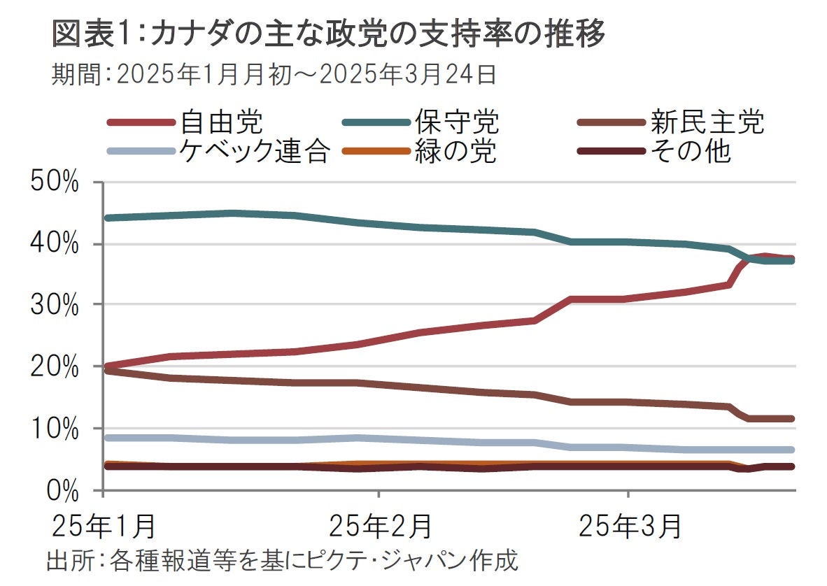 カナダのトルドー首相(当時)は1月6日に首相を辞任する意向を表明した。インフレ対策などを巡り与党・自由党の支持率が低迷続きであったことから決断を迫られた(図表1参照)。トルドー氏の後継者となったマーク・カーニー氏は3月14日にカナダの24代首相に就任した。