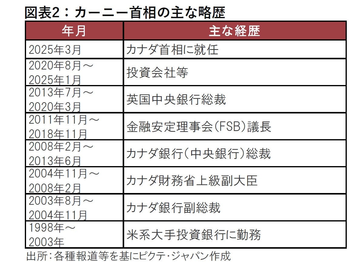 カーニー首相の経歴を振り返ると、カナダと英国(イングランド)の中央銀行総裁を歴任しており金融政策に通じている(図表2参照)。なお、イングランド銀行は300年以上の歴史の中で外国人が総裁に就いたのはカーニー氏が初めてだ。カナダ銀行(中央銀行)副総裁を経て08年に総裁就任したが、就任直後にリーマンショック(世界金融危機、08年9月)に見舞われたが、辣腕をふるい、カナダ経済への影響は比較的小幅にとどまった。2011年には金融安定理事会(FSB)議長に就任するなど、自らを「危機の男」と自認している。