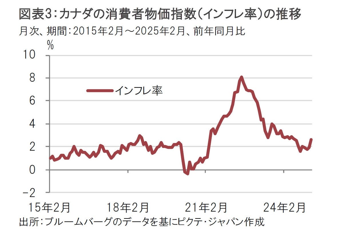 さらに、物価高もトルドー前首相が不人気であった原因のようだ。カナダの2月の消費者物価指数(CPI)は前年同月比で2.6%と落ち着いているが、カナダ銀行は23年7月から24年6月まで政策金利を5%に維持するなど、高金利政策を余儀なくされた(図表3参照)。トルドー前首相の移民政策が住宅価格を押し上げたことは不人気の最大の理由ではないかと筆者は見ている。トルドー氏も辞意を表面する会見で移民政策の失敗を認めている。当時(25年1月)の政党支持率を見ると、与党は20%を下回る調査がある一方で、野党の保守党は40%を上回る調査もあった。