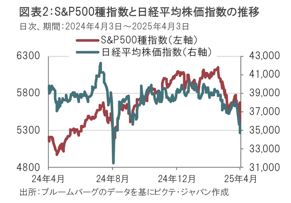 相場の格言として「噂で買って事実で売る」(噂のうちに買っておいて事実が確定したら売れ)がよく使われる。トランプ関税(4月2日の相互関税)の発表内容を確認するとさらに売りが加速する展開となった(図表2参照)。事前の想定よりも相互関税の発表内容が厳しかったことを物語っている。