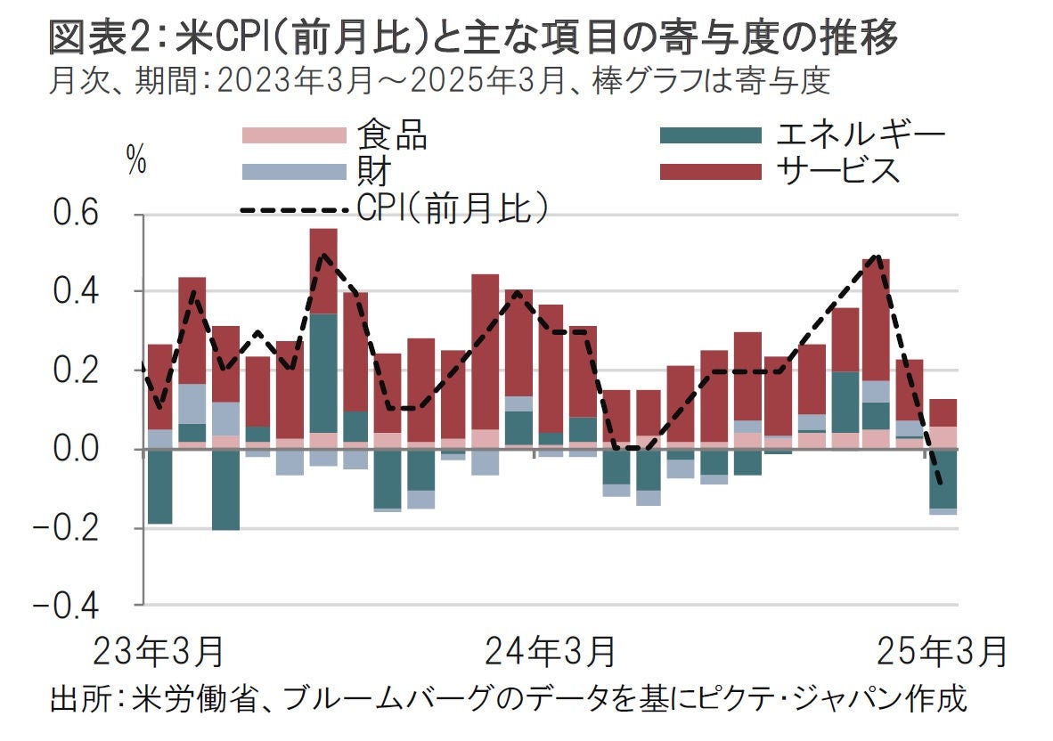 今回のCPIで前月比の伸びは、20年5月以来、ほぼ5年ぶりにマイナスとなった。前月比の伸びを、エネルギー、食品、財、及びサービスの4項目に分けて寄与度をみると(図表2参照)、エネルギーはガソリン価格の下落などを背景にマイナス寄与となった。