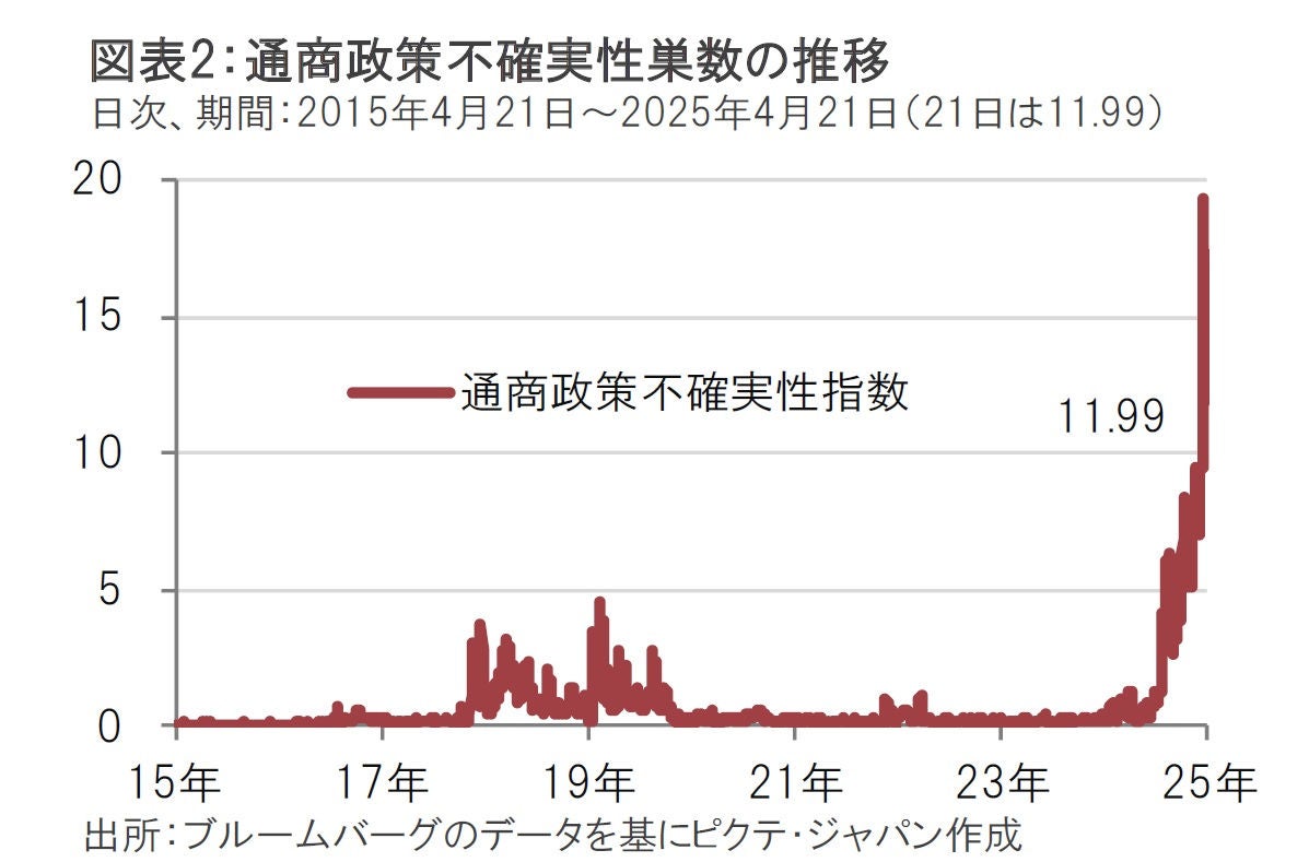 今回のIMFの世界経済見通しはトランプ政権の関税政策の影響が色濃く反映された。報道をベースに作成された(グローバル)通商政策不確実性指数(TPU)は急上昇し4月9日にピークをつけた(図表2参照)。この歴史的な通商政策の不確実性を前に、IMFは図表1に示した「基本シナリオ」を4月4日時点のデータを基に作成した。報道のヘッドラインの数字は通常この基本シナリオが使われており、25年の世界の成長率予測は2.8%となる。しかし、異例のことながらIMFは別の2つのシナリオ(経済予想)も発表した。