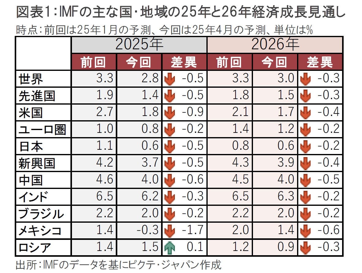 国際通貨基金(IMF)は4月22日、四半期に1度の世界経済見通しを公表した(図表1参照)。IMFは25年と26年の世界経済の成長率見通しを、それぞれ2.8%、3.0%とし、前回(1月見通し)から大幅に引き下げた(図表1参照)。トランプ米政権の高関税政策の影響でほぼすべての国・地域が下方修正された。なお、IMFはメインシナリオの予測を4月4日時点としたうえで、途中段階で見込んでいた予測値も公表するなど異例の対応となった。