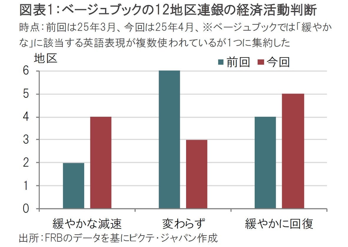 米連邦準備制度理事会(FRB)は4月23日に地区連銀経済報告(ベージュブック)を発表した。全米12地区のうち、5地区(ボストンやリッチモンドなど)が経済活動の緩やかな拡大と報告した(図表1参照)。また、3地区(クリーブランド、シカゴ、セントルイス)は前回から変わらずだった。一方で、ニューヨークなど4地区からは緩やかな減速が報告された(3月5日)。今回のベージュブックでは「関税」に関するトピックが幅広く見られた。