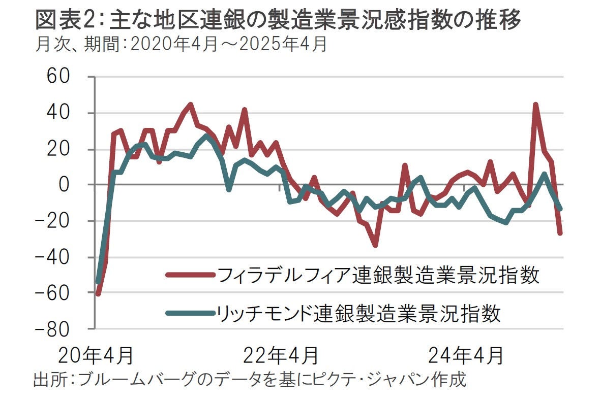 今回のベージュブックはトランプ政権の関税政策の影響が前回のベージュブックに比べ色濃く反映され、景気減速(図表1参照)の見方が増えた。しかし、4月後半に発表された地区連銀の景況感指数が示唆するほどにはベージュブックのトーンは悲観的でなかった印象もある(図表2参照)。今回のベージュブックは4月14日までの情報に基づいて作成されているため、関税政策の影響に迷う可能性もある。ただし、内容を見ると、景気への不安が強いように思われる。