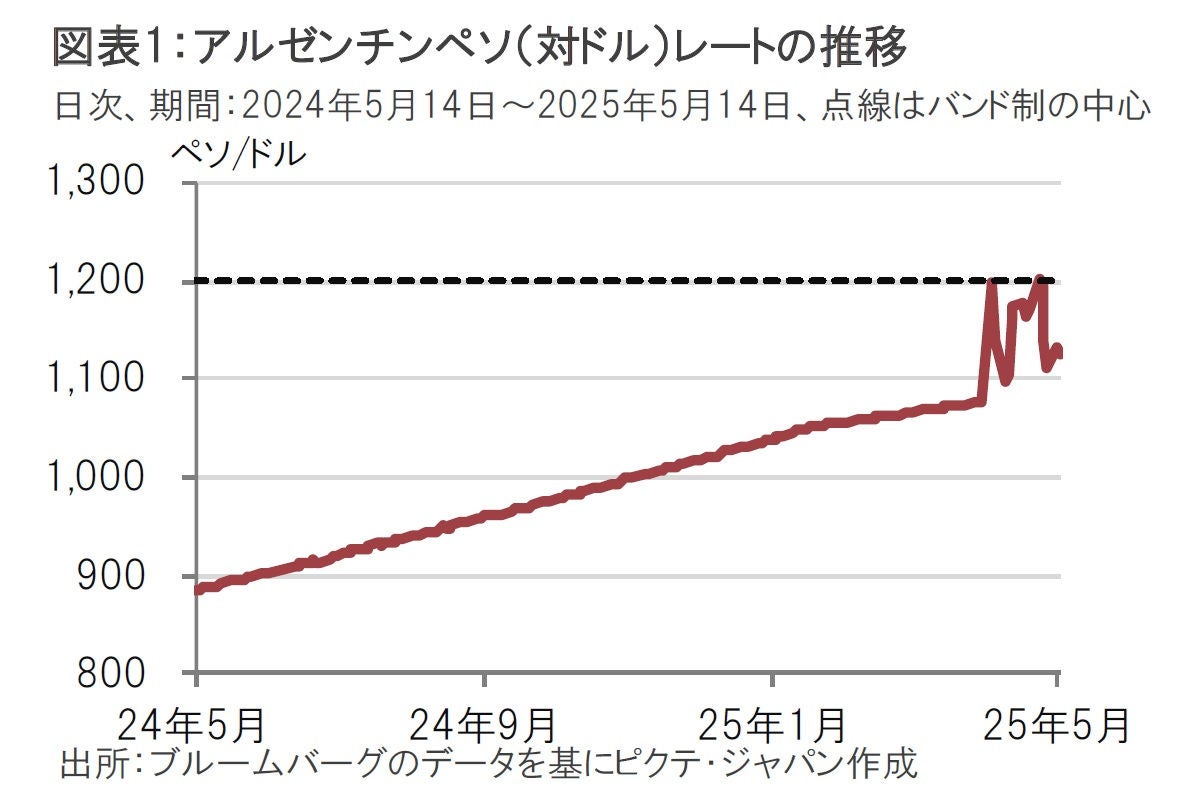 2点目の為替制度について、アルゼンチン中央銀行は4月14日に為替制度を従来のクローリング・ペッグ制から為替バンド制へ移行した。図表1で不自然な右肩上がり(ペソ安)が続いていた時期の為替制度はクローリング・ペッグで、月に2%(25年1月からは1%に変更)切り下げる運営をしていたがこれを為替バンド制に切り替えた。