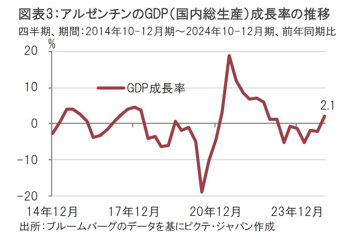 しかし、インフレ鈍化に伴い、実質購買力は改善傾向だ。24年10-12月期の成長率は2.1%とプラスに転じた。今後はアルゼンチンの信用力も過去の最悪期に比べれば改善していることが景気の押上げ要因となる可能性もある。フィッチはアルゼンチンの25年の成長率を5.6%と予想している。