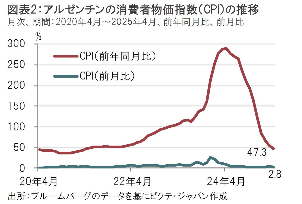 改革の成果が実感できるのはインフレ動向だろう。アルゼンチンの4月の全国消費者物価指数(CPI)は前年同月比で47.3%上昇と、24年4月の前年同月比289%をピークに、12ヵ月連続で鈍化した(図表2参照)。フィッチの予想では25年末には28%程度にまで鈍化することが見込まれている。
