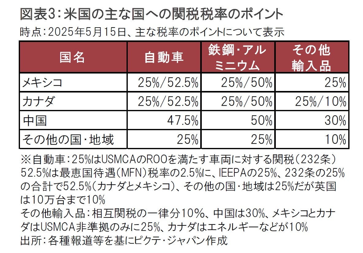 トランプ政権は4月2日に相互関税(世界一律10%と、一部の国・地域に対する上乗せ関税で構成される)を発表した。また、別途自動車など品目別に関税を発動した。これに対し報復関税で対抗した中国への関税が引き上げられたが、市場への影響が深刻であったことや、米中貿易協議の進展で当面は中国に対する関税率は30%、その他の国・地域は10%となっている(図表3参照)。