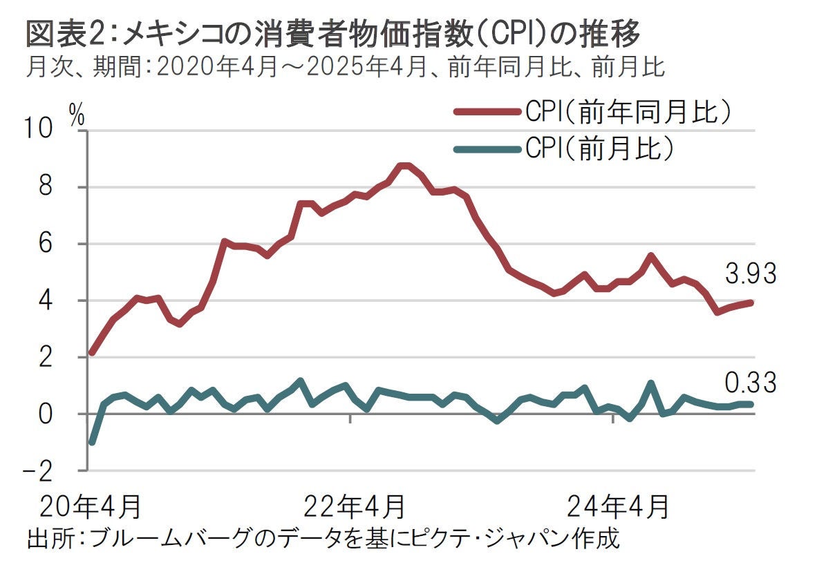 声明文の主なポイントを以下に振り返る。メキシコのインフレ動向を消費者物価指数(CPI)で確認すると、4月は前年同月比で3.93%上昇と、前月の3.80%を小幅上回った(図表2参照)。しかし、22年9月のピークからは明らかに鈍化傾向であるうえ、物価目標(3%±1%)の上限は下回っており、目標の範囲内と見られる。