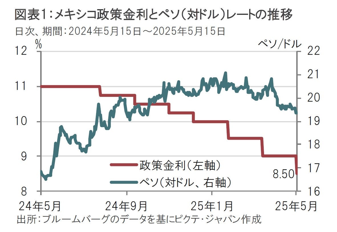 メキシコ銀行(中央銀行)は5月15日に金融政策決定会合の結果を発表し、市場予想通り政策金利を0.5%引き下げ8.5%とすることを決定した(図表1参照)。利下げは7会合連続であるうえ、2月、3月に続き0.5%の大幅利下げを全会一致で決めた点でハト派(金融緩和を選好)寄りと見られよう。