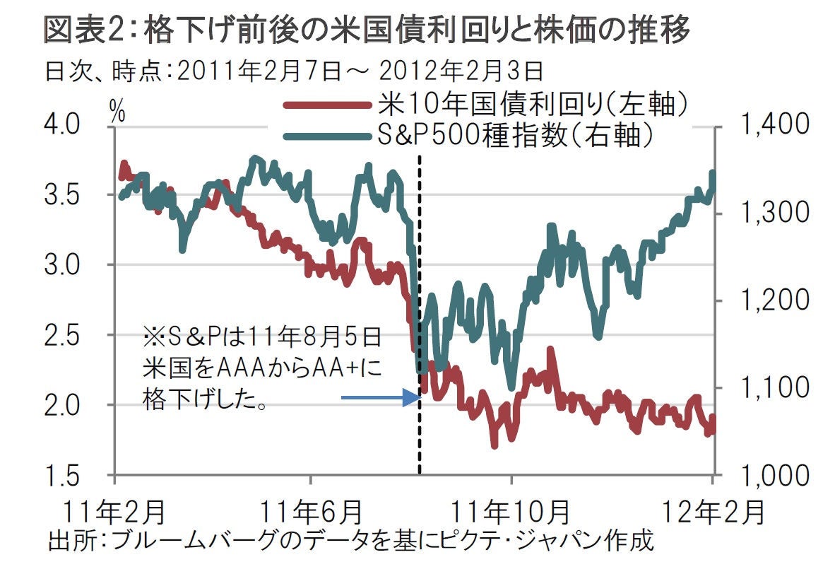 米国の格下げで気になるのはデフォルトよりも、市場の反応だろう。S&Pの11年8月の格下げ後、米株式市場は急落したからだ(図表2参照)。急落後、株価はしばらく伸び悩んだが、その後回復に転じた。なお、財政悪化などを背景にS&Pは米国を格下げしたが、米10年国債利回りは、低下傾向を維持した。当時は欧州債務危機が深刻であったため逃避先として米国国債が選好されたうえ、格下げ後のAA+とAAAにどれほどの差があるのかという声もあったようだ。今回のムーディーズの格下げによる市場の反応は米国市場を見る必要はあるが、格下げのあった金曜日引け間際と、週明けの時間外取引の反応からは株安と国債安(利回り上昇)が見られた。S&Pの格下げとは市場の反応のパターンが異なる可能性もありそうだ。