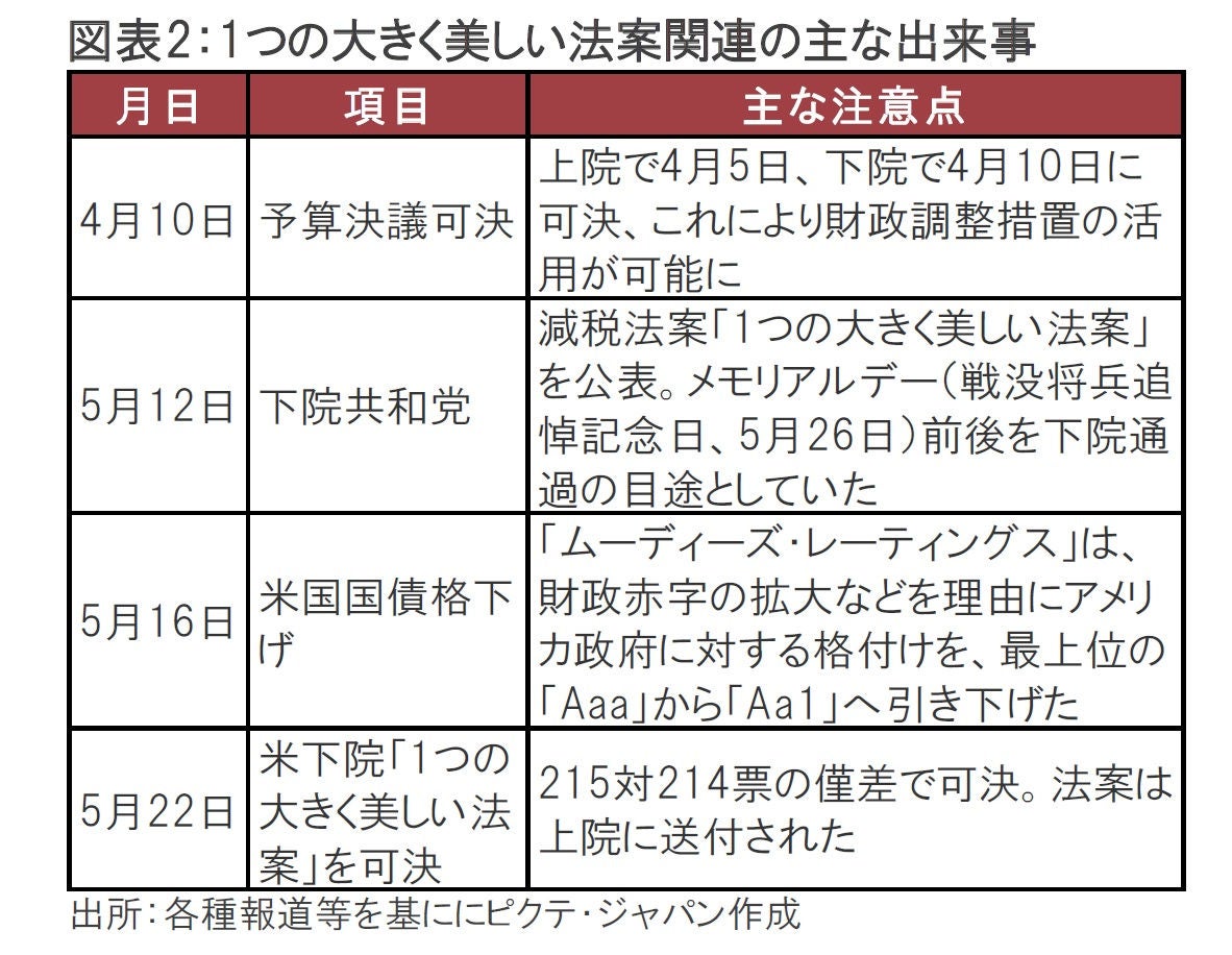 米議会下院は5月22日にトランプ米政権の1期目に導入した減税策の延長を含む「1つの大きく美しい法案」を可決した(図表2参照)。この法案は上院に送られた。法案に関連するこれまでの動きと今後のポイントを振り返りながら、市場や経済への影響を確認する。